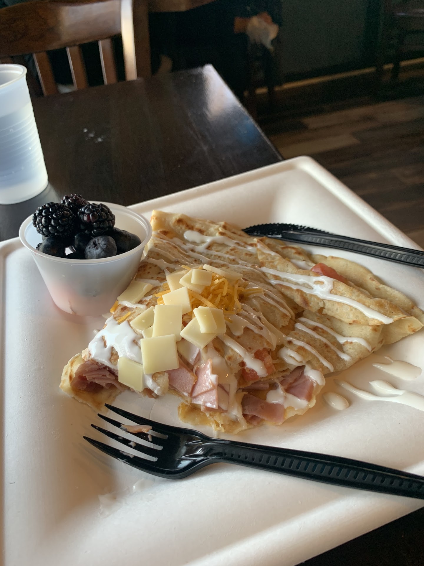Read moreLast night my wife and I dropped in for some dessert. Frogg has a perfect location in Watters Creek. The outdoor patio seating has a great view of the park in the center of the shopping center. Very nice atmosphere and ambiance. Unfortunately those are the best things about the restaurant. We ordered a bananas foster crepe along with a cappuccino for myself. The crepe came in a timely fashion, roughly 5 to 10 minutes. I asked about the coffee and the waiter said it was “still working.” After taking about 10 minutes eating the crepe, which was fine, I went inside and asked about my cappuccino. “We are working on those next,” is what I was told. We waited another 5 minutes outside and I finally went inside and decided to wait by the coffee bar until my drink was ready. I was asked “if I needed something” to which I replied, “yes, the cappuccino I had ordered nearly a half-hour earlier.” They said it would be “coming right up,” so we waited another five minutes before the barista asked me “was this for here or to go?” I said I had hoped to have the coffee with my dessert, but since I finished that 15 minutes earlier I would have it to go. Another thing I found annoying was how the barista banged the bags of ground coffee on the bar to break it up before preparing the coffee. Surely there must be a way to do that without making such a jarring sound. I will try another visit because I want to like this place. If the service improves I will adjust my rating...