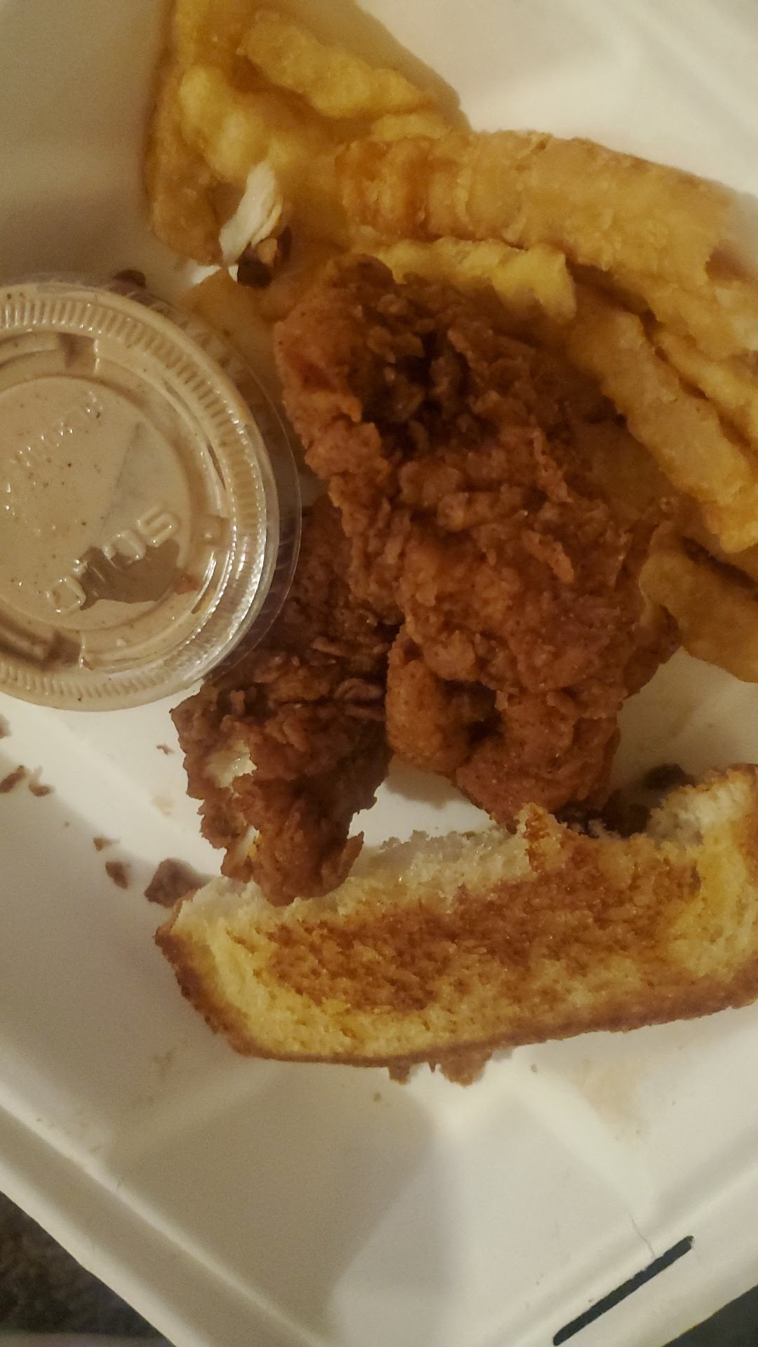 Ā Ā Ā Read moreThe food here is pretty good. They really keep me coming back for the fries. Personally I'm not a huge fan of the toast but that's just my opinion. Slightly more objective though is the inconsistency in the doneness of the chicken. Sometimes it's fantastic- perfectly done and tender, other times it is basically battered chicken jerky. Usually though, it's good. What really bothers me about this place is that every time I order, I have absolutely no idea what will be coming through the window to my car. Genuinely I tell you, maybe only 15-20% of the time is what I ordered actually what comes through the window. I always ask for no toast, sub extra fries, and I'd say about 50% of the time the toast is still there, sometimes with and sometimes without the extra fries that were supposed to replace it. If you request no drink, there may or may not be a small discount. I'm fairly sure there is supposed to be per company policy, but it seems utterly random. Sometimes I get extra or missing fingers, sauces, or incorrect sauces. A few times, I have gotten an entirely different order and didn't notice til I got home that instead of original fingers and fries - I had a spicy/bbq sandwich with cheese, on the toast I'm not especially fond of.
