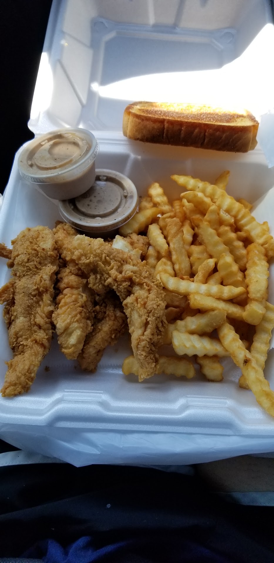 Ā Ā Ā Read moreThe food here is pretty good. They really keep me coming back for the fries. Personally I'm not a huge fan of the toast but that's just my opinion. Slightly more objective though is the inconsistency in the doneness of the chicken. Sometimes it's fantastic- perfectly done and tender, other times it is basically battered chicken jerky. Usually though, it's good. What really bothers me about this place is that every time I order, I have absolutely no idea what will be coming through the window to my car. Genuinely I tell you, maybe only 15-20% of the time is what I ordered actually what comes through the window. I always ask for no toast, sub extra fries, and I'd say about 50% of the time the toast is still there, sometimes with and sometimes without the extra fries that were supposed to replace it. If you request no drink, there may or may not be a small discount. I'm fairly sure there is supposed to be per company policy, but it seems utterly random. Sometimes I get extra or missing fingers, sauces, or incorrect sauces. A few times, I have gotten an entirely different order and didn't notice til I got home that instead of original fingers and fries - I had a spicy/bbq sandwich with cheese, on the toast I'm not especially fond of.
