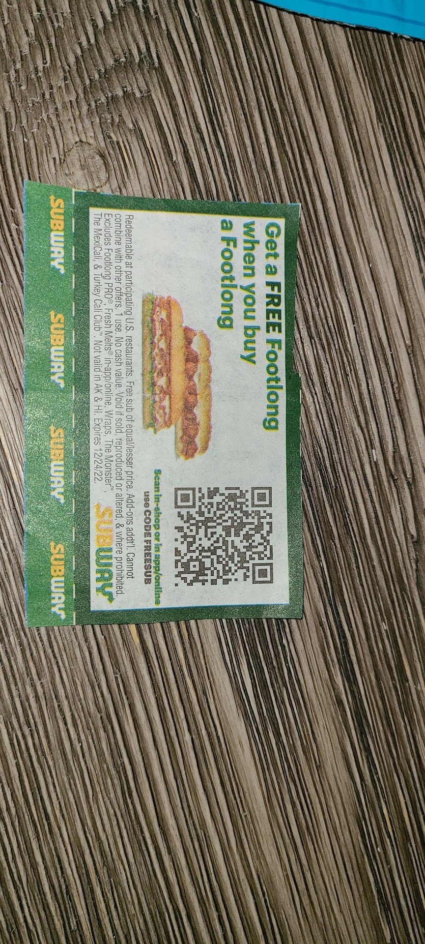 Read moreEver since they remodeled this subway it's been downhill on service. Yesterday had a worker absolutely butcher "the outlaw" sub from their "subway series". All the ingredients except for dressing are supposed to be put on before they toast it, I wasn't paying close attention and the worker toasted it before he put the onions and bell peppers so I had raw onions and bell peppers on my sandwich. It was so bad I wasn't even able to finish eating it. When my spouse went to pay for us, the man refused to accept our coupon that was in the mail, and definitely still in date. He was also rude and just clearly had no idea what was going on. We came here to give it a second shot since last time we came it was shoddy service. We will not ever be returning to this location. This happened at around 6pm on December 6th, 2022. Pic of coupon attached below, i assume they just didn't want to...