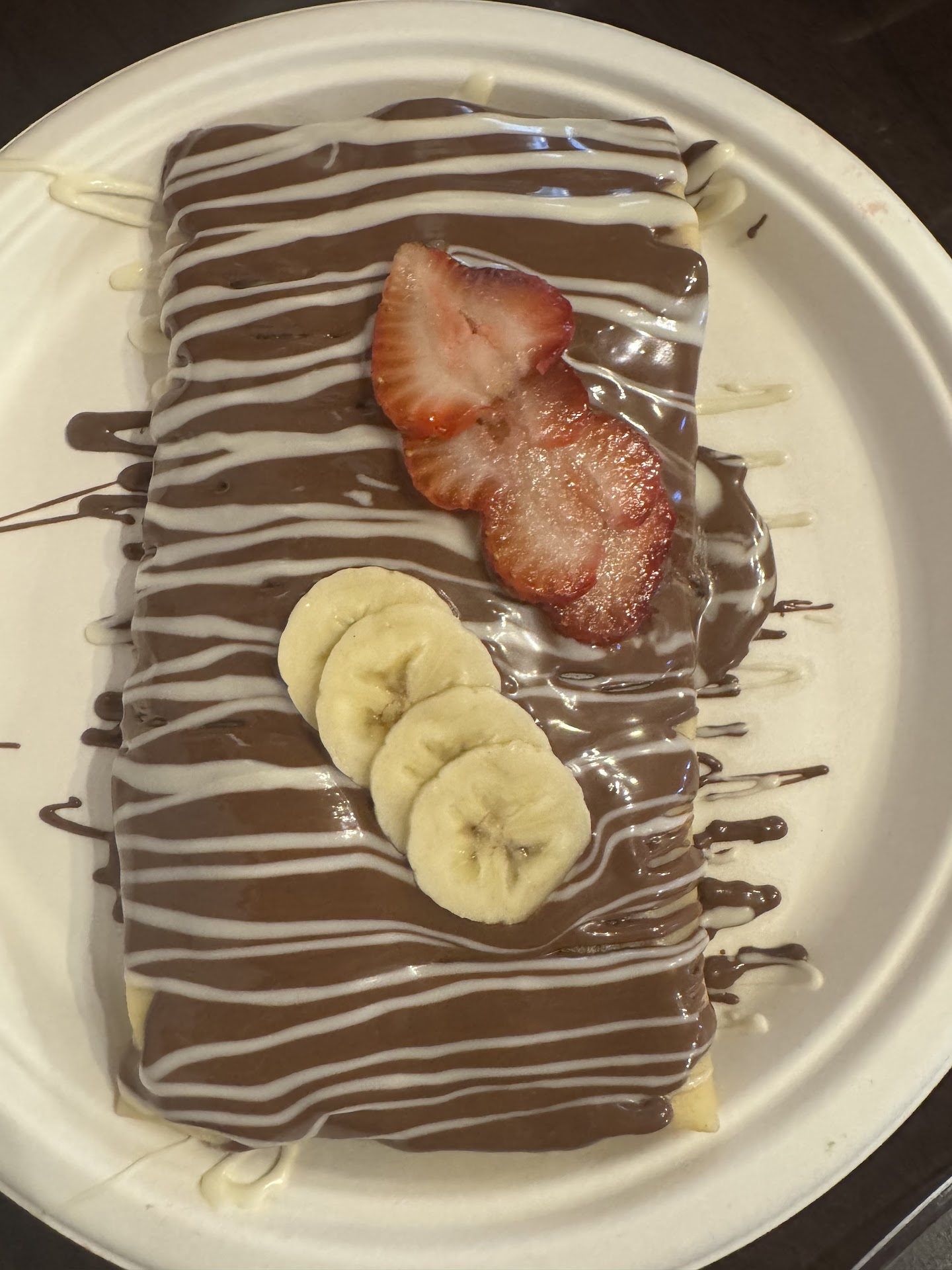 Read moreI went here with a family member visiting from out of state on Valentine’s Day. We got the fettuccine crepe which was pretty good. They do charge $1 extra per any additional toppings. Making it very costly. I was very surprised the crepe wasn’t served warm, especially with the vanilla ice cream. They said it wasn’t supposed to be served warm as it cools down with the ice cream and whatnot. But I believe it’s definitely possible to have it warm if served immediately.