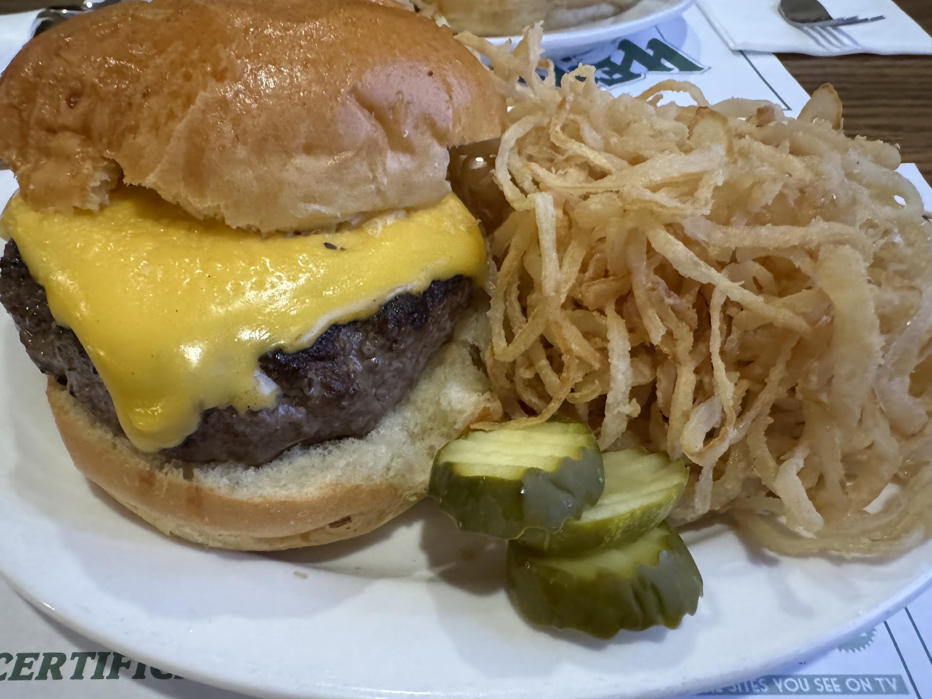 We ended up taking half our food home as the burgers were close to if not a half pound and the onion rings/straws could have easily fed 6.