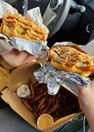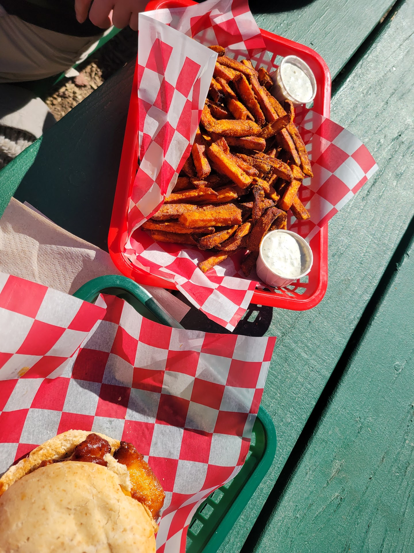 Basket behind the sandwiches: Sweet Potato Fries with light Cajun seasoning served with a side of Garlic & Herb Aioli and Carolina Sweet Mustard. Mhmmmm You have to have the sweet mustard with the sweet potato fries!...