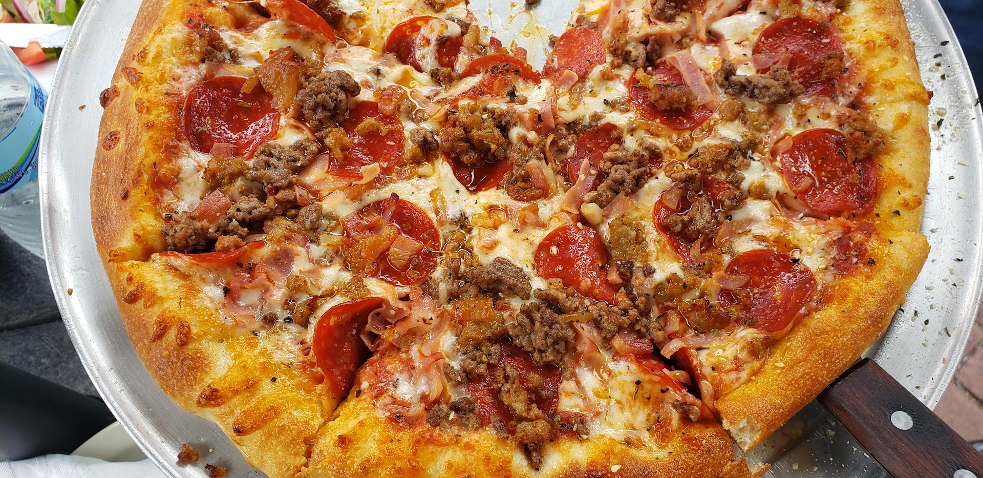 Read moreCame up for a weekend out of town with some friends and decided to try this pizzeria because of the reviews I feel as if maybe the employees came and rated their business because it’s almost 5 stars but we ordered 2 large pizzas and a cheesy bread it was a bacon chicken ranch and a 3 meat pizza they got the 3 meat wrong and made it a supreme no big deal we bit the bullet but the pizza reminded us all of a cafeteria pizza from school and the bread was kinda over cooked definitely not worth...