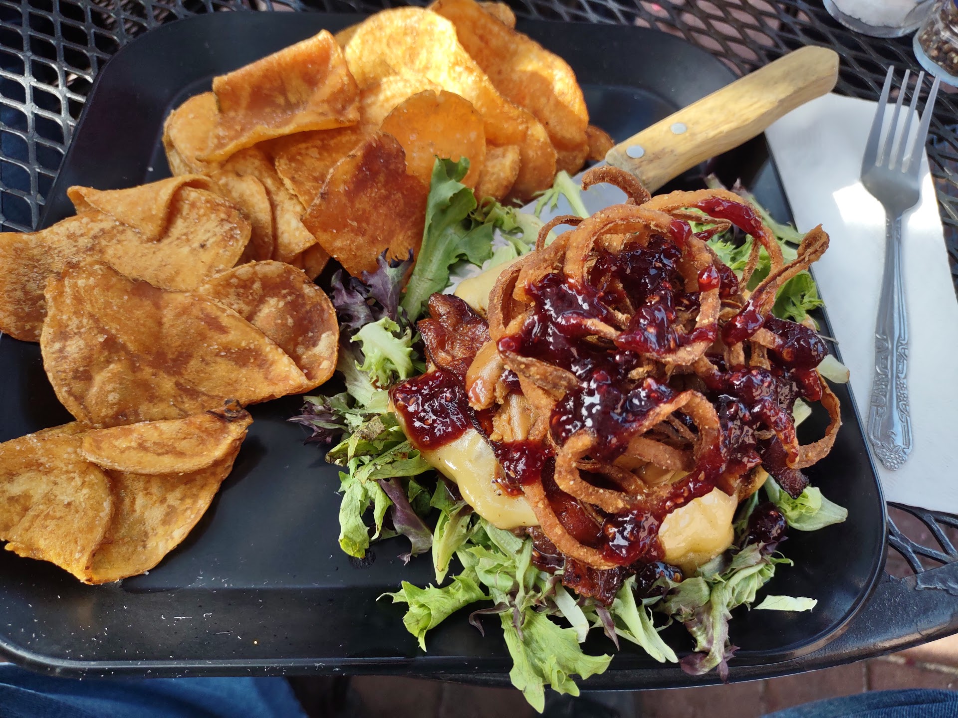 Read moreGreat burger joint that has a wide selection of specialty burgers, plus create your own. They also have some vegetarian choices along with pulled pork, cod, and shrimp choices. I had the 1/3 lb PB&J burger (bunless, served on a bed of greens), topped with bacon, smoked Gouda, thai peanut butter sauce, and a raspberry sauce. Their sauces are homemade, and taste it. The peanut butter sauce went surprisingly well with the burger and had great flavor, and was a creamy consistency. The raspberry sauce was a little sweet for me, but paired well with the peanut butter. I was hesitant about ordering, but glad I did. Very tasty. The burger was served with house made chips that were good. If you like burgers, this is a great choice of restaurant. Service was friendly and prompt....
