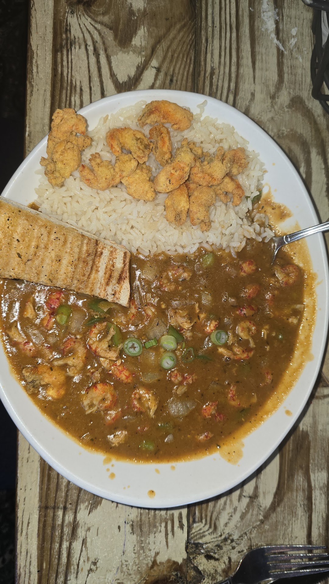 I ordered the shrimp and grits and 1 because I was looking for a little spice and the menu said spicy. It did not disappoint. Not the traditional shrimp and grits but with a bit of andouille. It was delicious. I also had a gumbo. To much but the spice was excellent. Not as hot as I would make for myself but not at all bland so as to still give a sense of Louisiana food. Here's a great theme for all 4 meals we ordered there was NO oversalting! It's a pretty peev and when Southern restaurants get it right I notice. My wife and brother-in-law enjoyed the blackened trout and the waiter made side adjustments to my wife's with no hesitation and got it right, not hard but ppl get it wrong too so worth noting when it is seamless. My sister in law had the catfish po boy that made me question my order. Looked great and tasted great according to her.