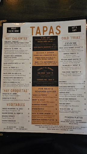 I went there with one other person, and we ordered six tapas plates and just water to drink. It's little tapas plates, so it was a good amount of food, but not a lot of food. We ate it all without really getting overly full. We went to a different place for dessert.