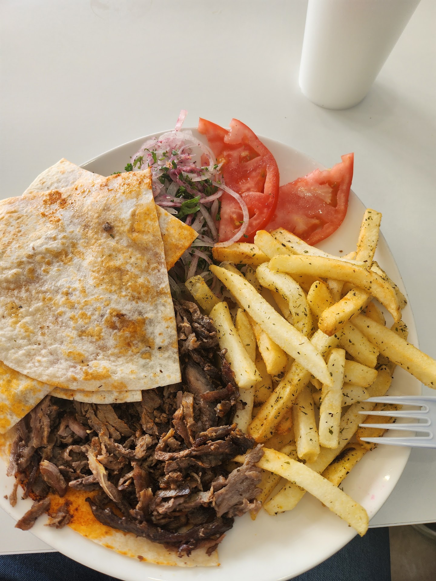 Food - 5/5. We ordered a gyro with fries and a side of spanakopita. Quantity: 5/5. Gyro was stuffed with a good amount of meat and toppings. Loved that they included a small cup of tzatziki sauce. Fair amount of fries. Three spanakopitas came with a single order. Appearance: 5/5. I really should just take pictures. Everything looked great. Fries and spanakopita were fried perfectly and the gyro had a well balanced color combo of the greens, tomatoes, meat, and sauce. Veggies appeared to be fresh. Taste: 5/5: The gyro meat was hot and juicy. Veggie toppings were fresh. The fries really stood out with the toppings and lemony flavor sprinkled on them. We dipped our fries into the tzatziki sauce instead of ketchup and the sauce was good.