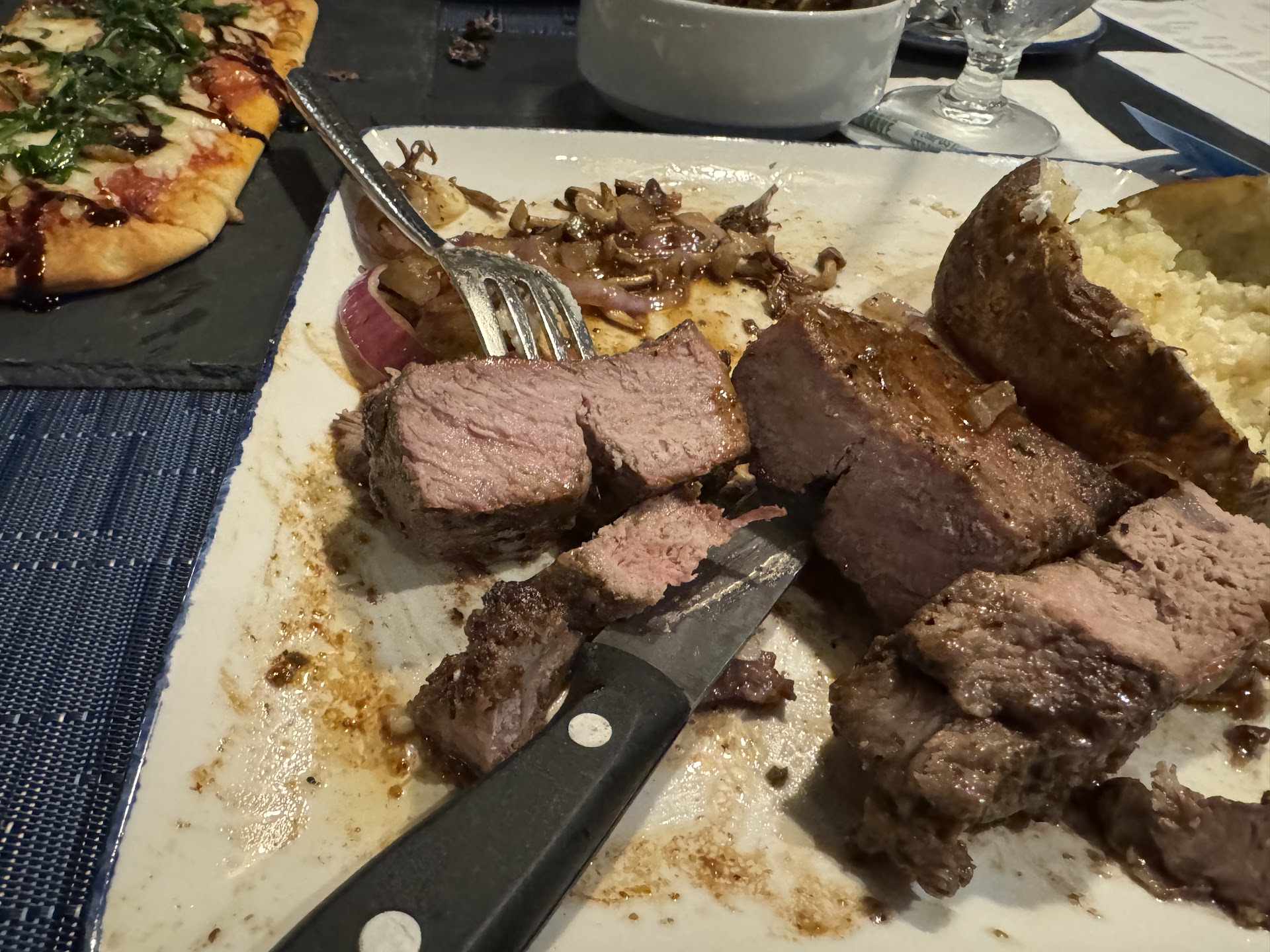 Steak: ordered medium. See photo. Super overcooked, like almost well-done. I rarely ever order red meat, so this was a pretty decent size splurge for me. Disappointing. Baked potato came out nekkid. Had to ask for butter and sour cream. After the dude brought it, I realized there was no salt/pepper on the table. I didn’t bother him by asking for any since he was apparently traveling back and forth from like Narnia each time. (He was nice enough, just felt like somebody randomly dropped him into a server position, and him having zero grasp of how to do it).