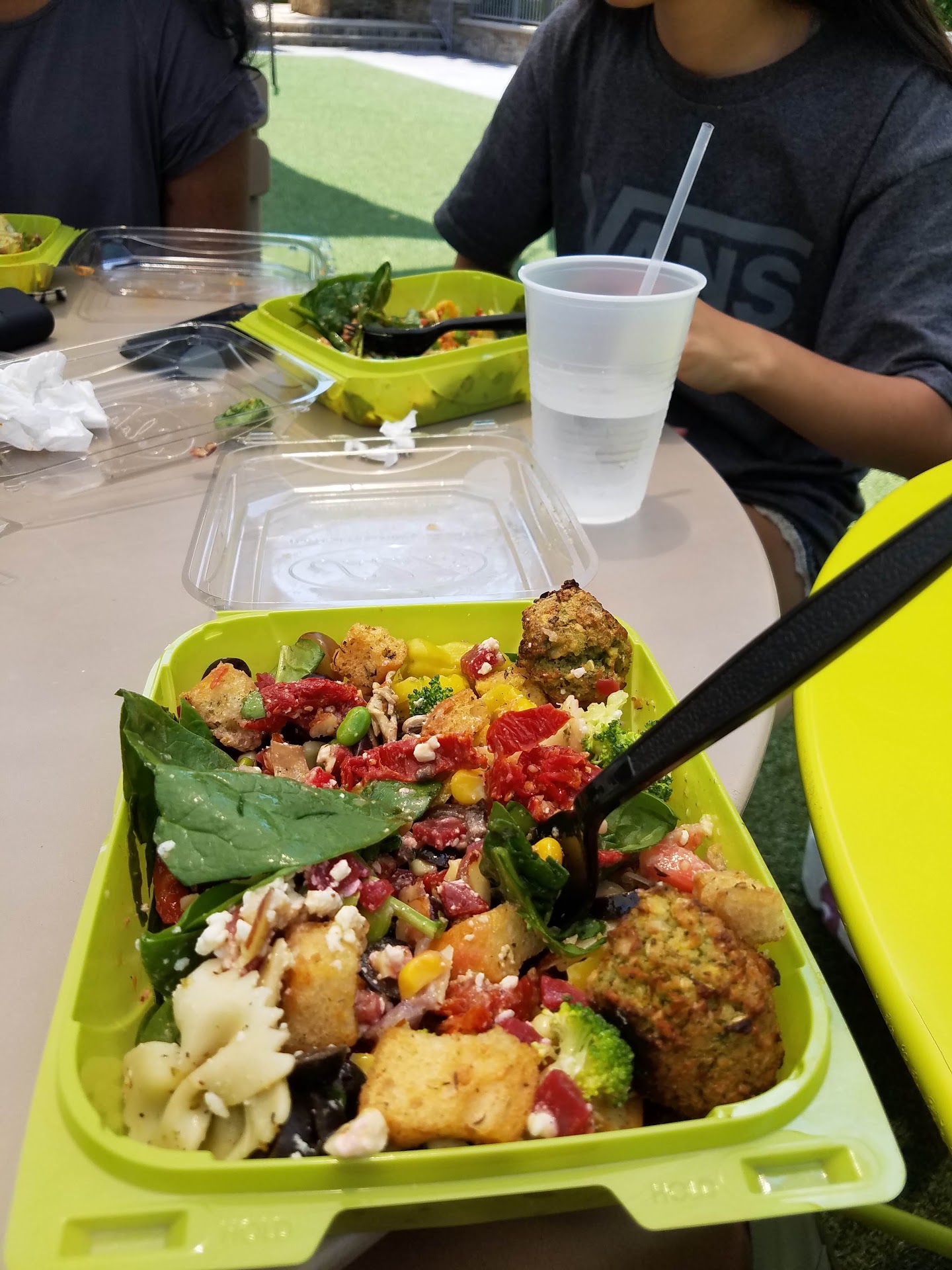 We pulled up and noticed what we believed to be an employee outside the restaurant. He was wearing a black Nike shirt and a green hat, but nothing he had on had the Salata logo. We thought nothing of it and went inside. No one was there to greet us so we waited around 5 minutes. My husband walked towards the back where a woman came out. She began making our order where she let us know she didn’t speak English. We didn’t mind and assured her she was doing well! While she was making our food, the employee that was outside and a taller man in a Salata shirt came back inside where it was apparent they had words outside. The male in the Nike shirt went to grab a drink from the cooler before he left. The taller man (we assume is a manager) yelled at him and told him to put it back as he was stealing and no longer was employed there. They went back and forth for a few seconds before the manager got it from him and Nike shirt walked out.