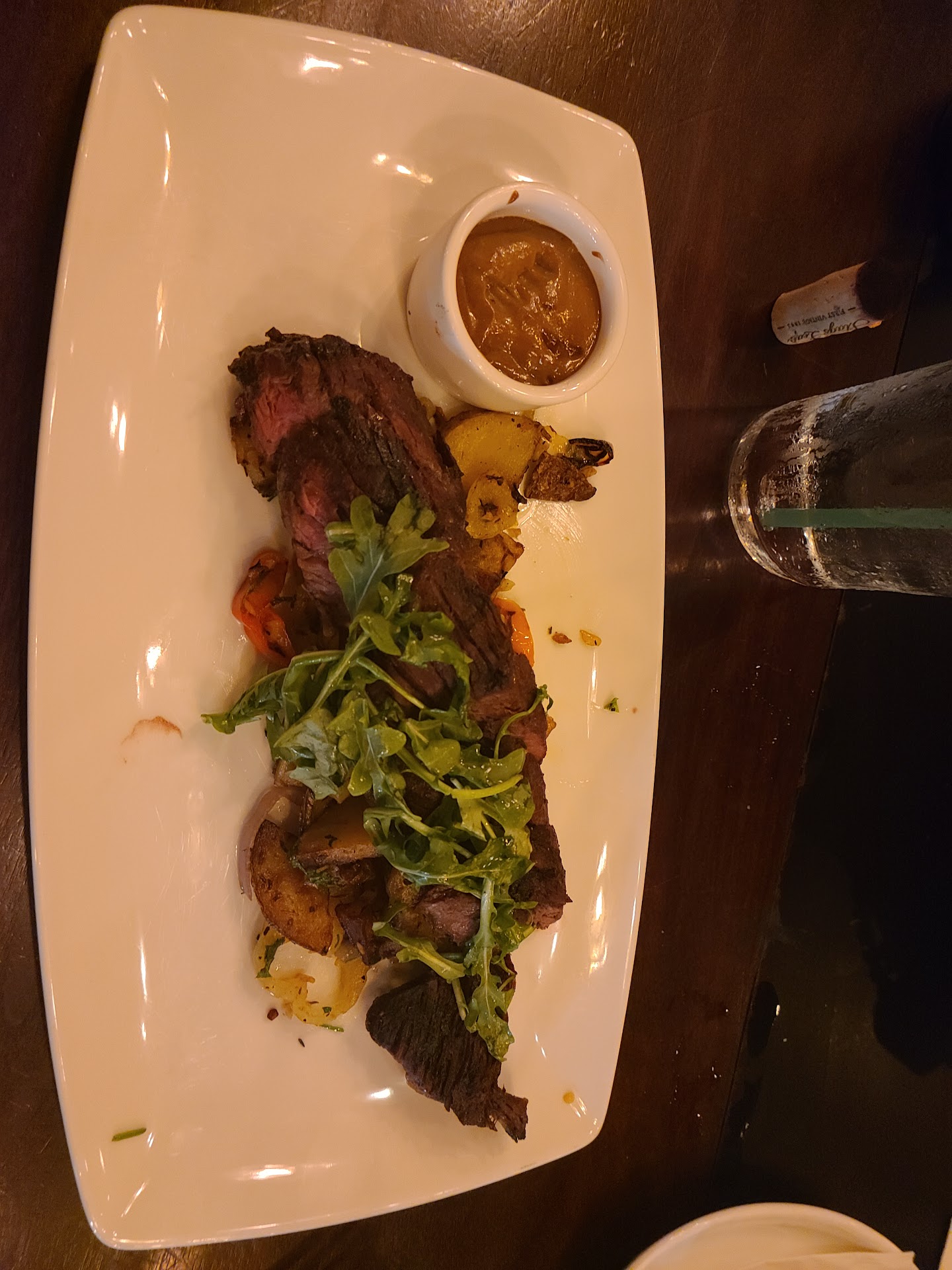 The entrees came out and they were great. Hanger steak is what I ordered and it was spot on the money. The fried Brussels were great too but be sure to share w 2 or 3 people. One caveat here(again w the service): 1 person ordered a salad for dinner(no entree) and they ended up bringing this out before the entrees and leaving salad person empty handed during entrees time. I guess this is a pet peeve of mine but waiters and waitresses should not deliver like this or atleast ask about it.