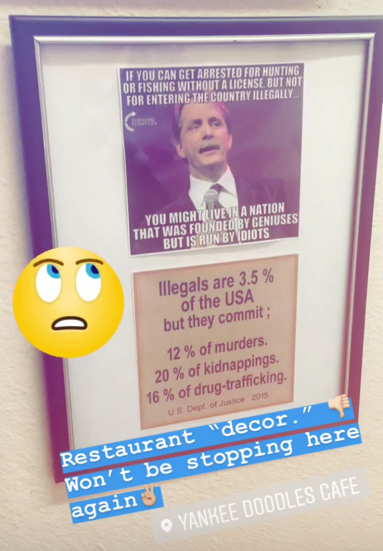 FIRST OFF IF I COULD GIVE A 10 STAR I WOULD!!!! We stopped in this past week for lunch. The food was very good and serving size was so big way more than i should have ate. The staff was super friendly. I wouldn't expect anything less with a place that love it's country as much as this place does!!! This place is covered with USA flags, signs, trinkets, picture's and even the sugar is RED WHITE AND BLUE VERY NICE!!! It's nice to see some people still love and believe in the USA AND ITS FLAG AND WILLING TO STAND UP FOR IT!!! We will stop in here every time we are in Alpine, WY and sense we are looking to move there looks like we just found our new favorite place to eat!!!!! Funny a large part of the bad review about this place is over the right as business owners to run there business the way they want to and decorate it with USA FLAG. There 's nothing racist or hate related in the building AT ALL! JUST PROUD AMERICANS NOT SCARED TO SHOW IT!!!!! Pretty simple it the people that don't like the USA and want to change it that don't like this place are have a problem with it!!! AS FOR AS WHAT WOULD A BLACK FAMILY THINK IF THEY WALKED IN I'M SURE IF THEY LOVED THE USA THEY WOULD LOVE THIS PLACE AS WELL FUNNY HOW RACE IS ALWAY PULLED IN!!!!!!!!!!!!! I have black friends and they would love it!!! WAY TO GO OWNER AND STAFF FOR SICKING UP FOR THE GOOD OLD...