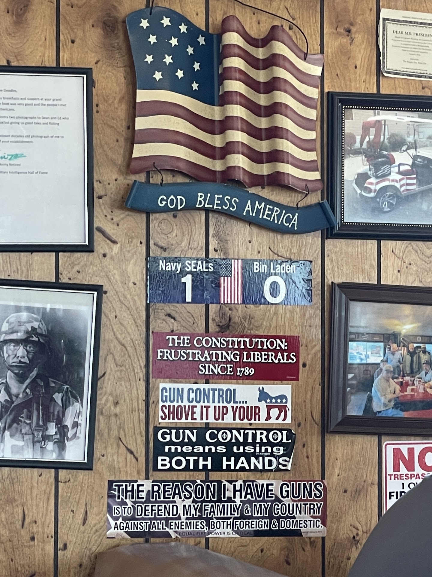 Ā Ā Ā Read moreThe food is pretty standard diner fare. I suppose if you're used to eating Hungry Man frozen meals for dinner and you consider McDonald's "eating out," then you'd think the food was spectacular. The decor is odd and strongly nationalistic, but I wasn't really offended by it. I'm a concealed carry holder and a veteran, but here's where the place loses my business: when I asked if they give veteran discounts, the waitress smugly said they only give discounts to active duty. I was pretty shocked considering right behind her there was a sign saying "land of the free because of the brave." I've been to more liberal establishments further west that proudly offer discounts to all who served and are currently serving. Apparently these people are all talk and no action. They love their country and the military, but don't really care for the veterans that actually served. I won't...