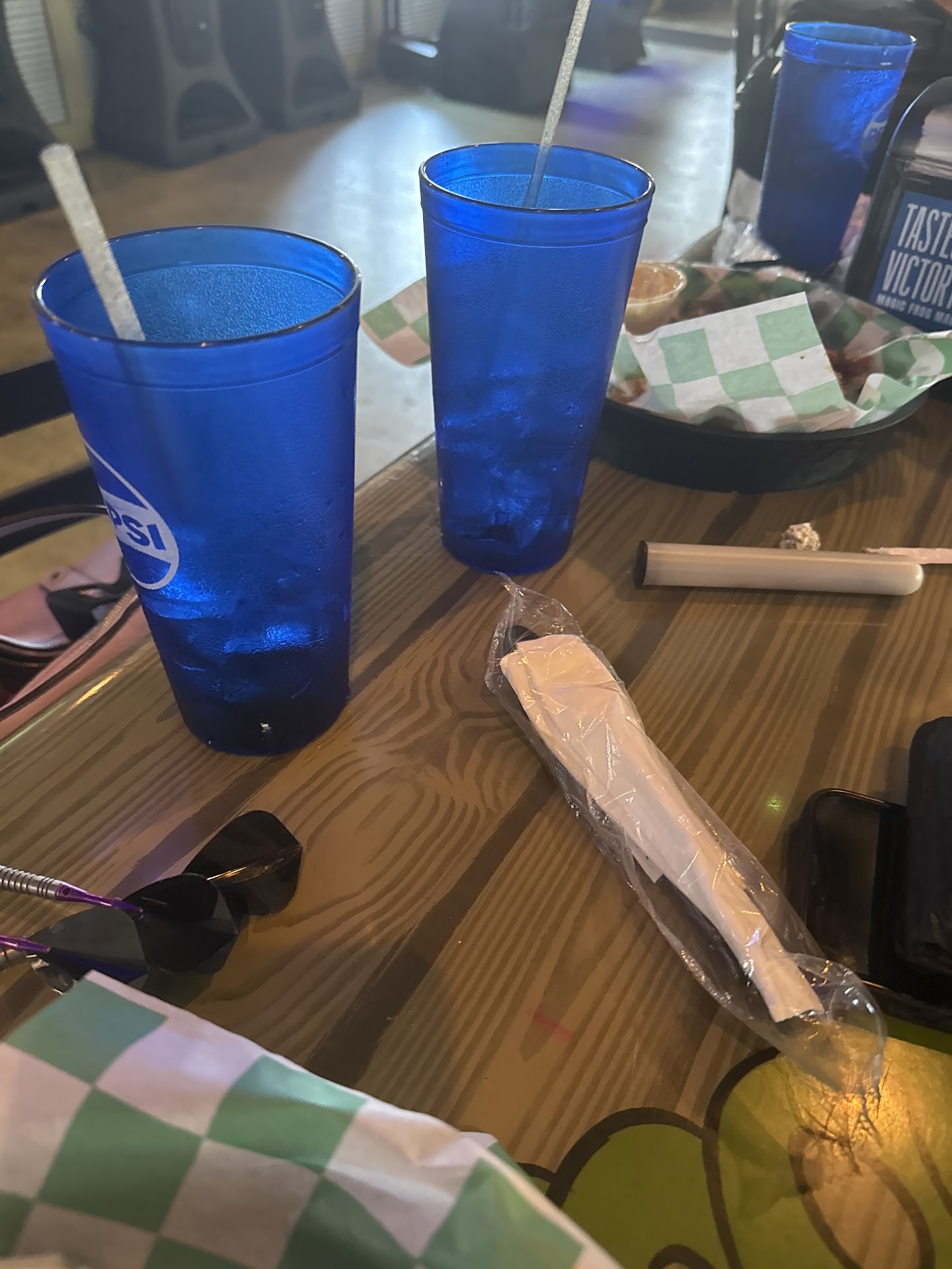 After some time we ordered 10 more wings to take for my son. She took our order and the manager brought them out to us about 10min later. They had her so busy that for 45min we sat there with empty drinks, a bag of now cold chicken wings and no check