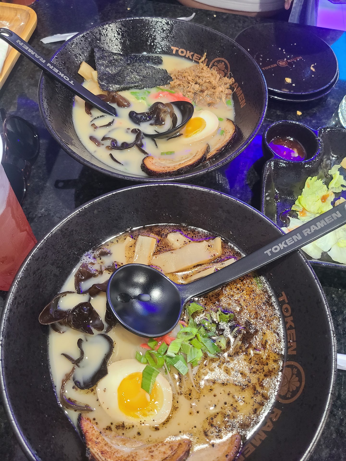 She got the Tonkotsu ramen (no egg, she’s allergic) and I got the Black Garlic ramen. I was hesitant because the first and only time I had tried Black Garlic ramen was in a random place in Atlanta and it was so salty, I thought I was going to dry OUT.