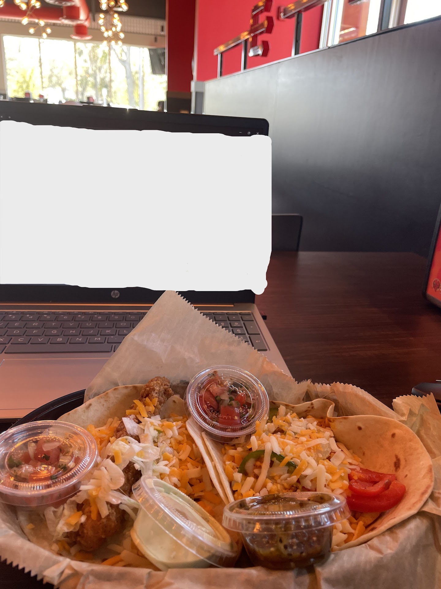 We ordered chips and queso and 3 tacos. The tacos came out before the chips, and they were the saddest looking Torchy’s tacos I’ve ever seen. Usually I’m cleaning up my plate with a fork because they’re so loaded up with ingredients. These tacos barely had anything on them. My wife’s Trailer Park only had one chicken tender about 2 inches long on it. Barely qualified to be called a nugget. Mine were a bit better as far as the chicken, but still nothing at all compared to what I’ve grown accustomed to over my years going to Torchy’s.