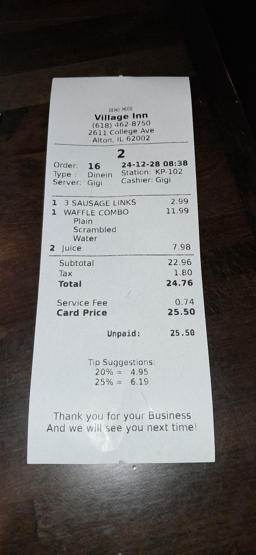Read moreStopped by Alton Village Inn Pancake House for the first time ever to have breakfast with my daughter. I was very impressed with the friendliness of the staff, organization of the restaurant, and the clean welcoming dining environment. The restroom was immaculate too. Gigi was our waitress. My daughter and I ordered the waffle combo. The presentation of our meals was very appeasing to the eyes, and beyond pleasing to our tastebuds. The food looked and tasted absolutely delicious. Gigi did an awesome job taking care of us today and making our experience memorable. The restaurant swelled with patrons from the time we sat down to the time we finished our meals. This attest to the quality and quantity of service and food served. We will be coming back to Alton Village Inn Pancake House for another dine-in in the near future. I live in Belleville, IL, this morning's breakfast stop was well worth the...