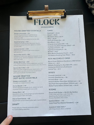 Read moreFlock (and the vintage holiday experience, “FLOCKed”) is an excellent cocktail bar. No matter the occasion - food truck events, Halloween parade, holiday festivities - Flock has outstanding cocktails. Everything is made in house and SO delicious. Extra creative cocktails - so impressed. EVERYONE SHOULD GO! FLOCKed vintage holiday bar has such a nice atmosphere. Fun, yet tasteful holiday decorations and lots of heaters hanging from the ceiling to keep you so warm and comfortable. The holiday cocktail menus is unbelievably good. So many fabulous flavors and just all around great cocktails. Go for a date or take your friends! You’ll have...