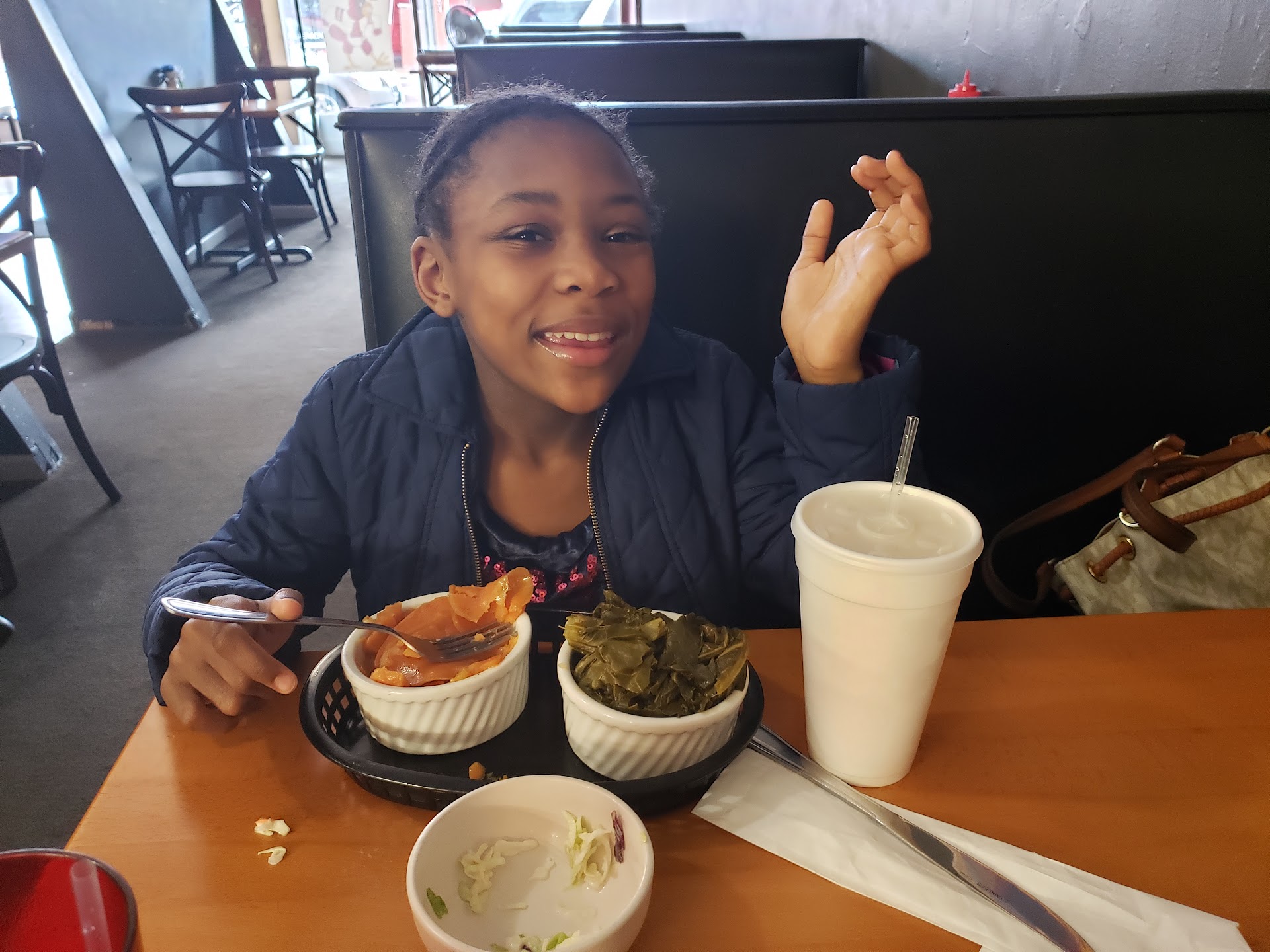 Lovett is a Soul Food place in Alton, IL. I had looked forward to visiting for so long. The menu on Facebook look so inviting but yet so disappointing 😞! Before entering there was either a BAD SPILL or Vomit 🤢 🤕 right at the entrence. That should have been a red flag. We went in and was kindly greeted. It was open seating. But oh boy, this restaurant is so old and out dated. It used to be a tavern that needs lots of love ❤️. The booths are the original booths and the seats are torn and worn. They tried some repair with grey tape, but it has seen its days. The mop and bucket is in the aisle near the bathrooms and the broom was setting at a table across from us. The carpet was SO OLD AND WORN 🔥 IT WAS BLACK AND STICKY. ⚫️ 😳!!