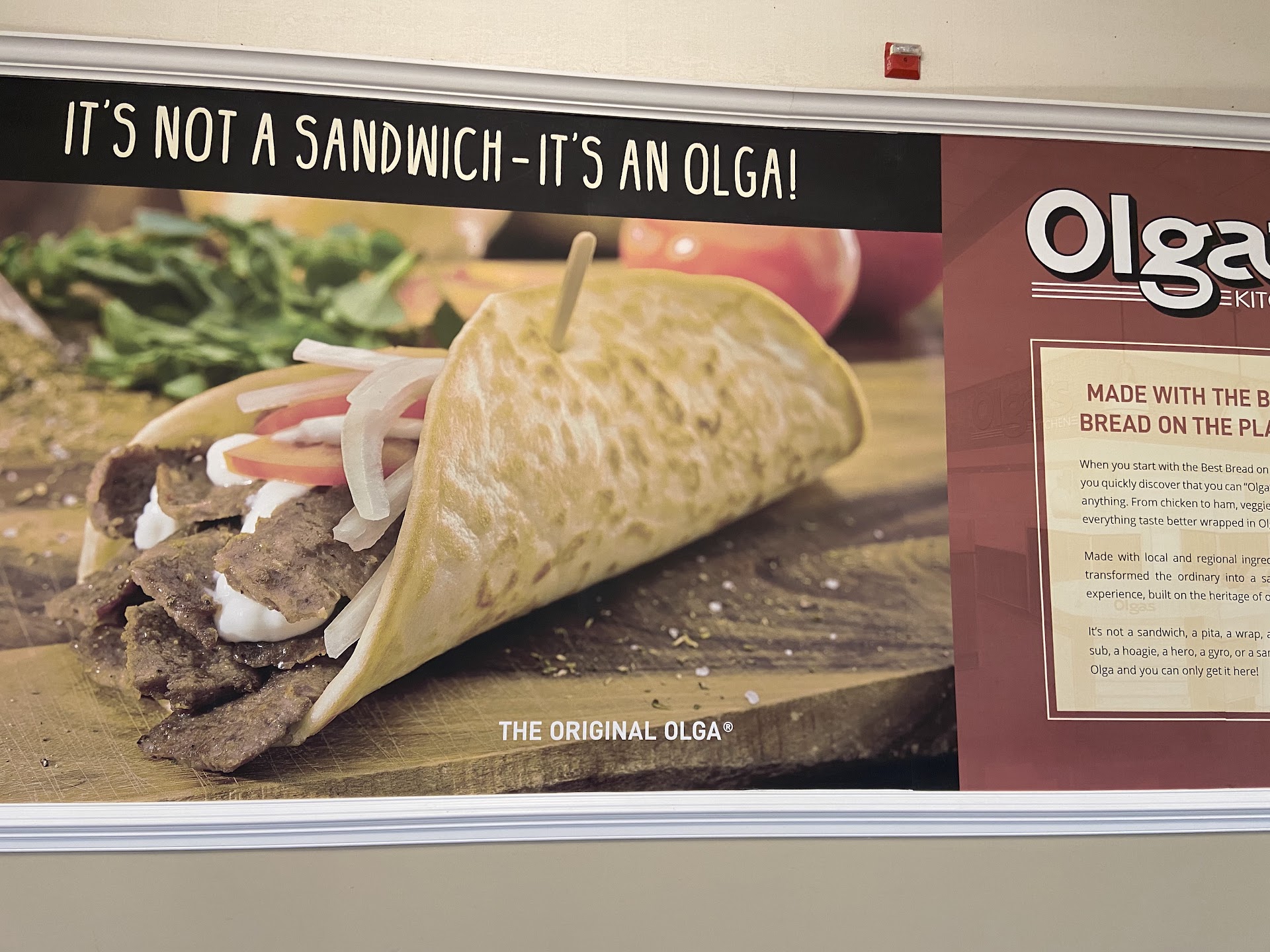 I ordered my Original Olga with the Olga sauce on the side because I like to eat half of my Original and take the other half home for lunch the next day. Well, it came out with the sauce on it, and our food came out way before we had finished our Snackers. Now we have two glasses, two saucers, the Snacker plate, salt and pepper shakers, ketchup, a sign and two entree plates on this tiny table. I really think it would be more convenient to put two people at a four person table.