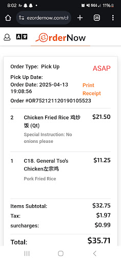 The WORST customer service. Both the man and woman yell at you when taking your order. They hung up on my daughter because she asked the lady to repeat herself because she couldn’t understand her. I should have let it go at that and ordered elsewhere, but I called back and placed the order. The man who answered also yelled. They act like they are so busy that they can’t take the time to speak to you nicely and are in a hurry to get off the phone. I ordered a side of white rice and steamed broccoli. A pint of white rice is $3.00. The white rice I received was no more than a cup. She charged me $7.25 for chicken and broccoli. I didn’t get chicken because that’s not what I ordered, but got charged for it. So a cup of white rice and a cup and a half of steamed broccoli for $7.25. Lost a customer, well several because no one in my house will order from there again. Can’t wait for the Thai place beside them...