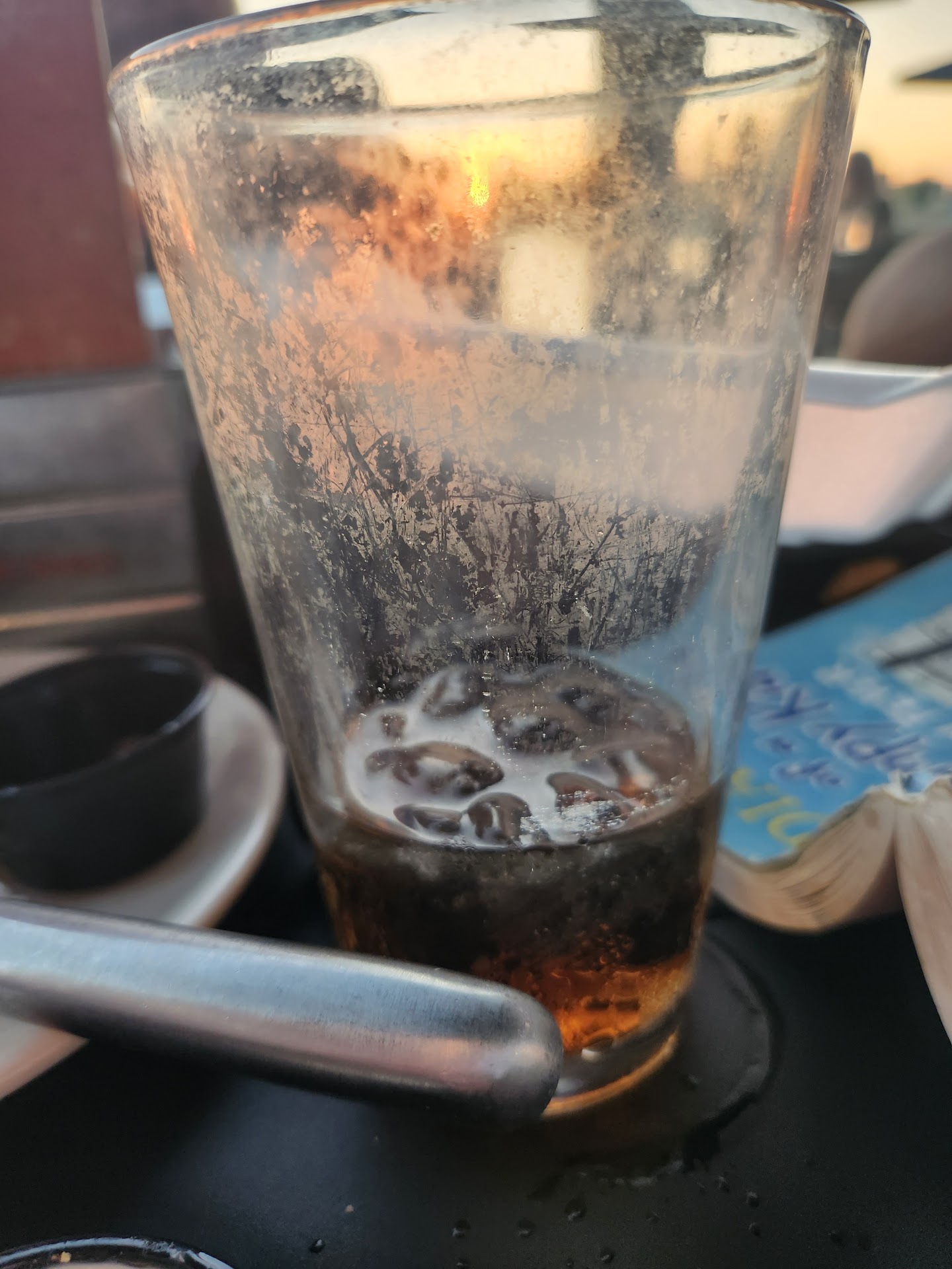 We then ordered our food and got 2 waters. The waters had gunk in them. White flecks of something. The cups were dirty and you could scrape the white film off of them into the water (see video). Got replacements and same issue although reduced amount of white flecks at least.
