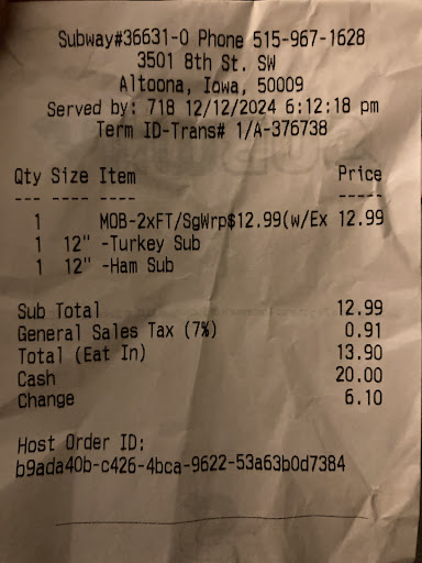Read moreThe only thing saving this subway was the fact that it's apparently the only one that accepts any sort of coupons in Altoona. Ordered a sandwich to go on the app while on my lunch break and what I got was not entirely what I had ordered. They did not have the bread I ordered, I had to search for the cheese, and despite asking for extra sauces they were incredibly scant I'm not even sure they were present.