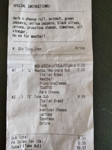 See my picture of receipt attached. (Under special instructions is what I was ordering then, and have done before with my previous orders which were fine.) It took a week for the manager Emily to reply to my complaint ( and 2 complaints filed online) The only reason that I believe she even bothered to call me back is because I got tired of no call back , and went directly to the store to to try and talk to the manager. My order was totally screwed up with wrong ingredients, I did receive the tuna and meatball sub which I ordered, but none of the condiments were correct. Emily insisted she had on video my exact order being placed correctly . She wouldn't agree that special instructions had anything to do with what I ordered???? I made my order under special instructions, which I have always done there with no problem before. This time it was totally screwed up and Emily would only argue with me and refuse to help me. I will never go there again and if you ever order through their app, you better call ahead of time to make sure they have it right, because you'll never get anywhere with Emily totally confrontational and disrespectful. Emily refused to help me under any circumstances. I will never go there again. The staff there was very nice. I showed them my receipt they were very understanding very friendly and nice. Emily is the rotten apple in this barrel. We all make mistakes (Except of course Emily) and the staff who assisted me with my issue were kind and had no issue with the mistake, but said Emily had to handle it. Funny thing is that the staff called her but she wouldn't speak with me. I feel sorry for that staff having to work...