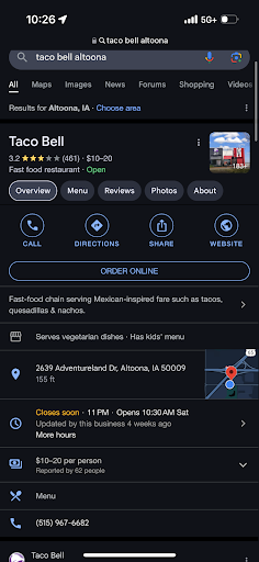 Read moreNever go to Altoona Iowa Taco Bell! I would give a minus 10 if I could. I was giving them another chance as my previous experience had not been a good one as well and I was utilizing, A coupon that Taco Bell had sent to me to make up for my horrible previous visit. The line was all the way out to the street. I pulled in to go inside. It was a cluster.. very slow paced ann slow moving orders coming out. The girl at the cashier desk was "deer in the headlights" could not figure out how to ring up my order our print out my receipt, had to keep consulting with the manager Jen. Shrugging their shoulders when asked how long the order would take to arrive. Totally unacceptable behavior in my opionion. I made a joking comment that they did not need to print out a receipt for my 2nd item that I was paying for, as I didn't feel like I needed to go and retake my psychology class, I was just making a joke but they took it personally. Jen The manager who I actually had a prior experience that was not positive, was having a bad day. Apparently that's every day she works! Mad affect and the downward frown going on. Workers avoiding the customers constantly looking down at their phones. Maybe they need to go get a job at a cell phone place. I only live 5 minutes away from Taco Bell and when I got home my new cheddar cheese chalupa that I was looking so forward to eating was barely luke warm. I will never step foot into their establishment again. Hope and pray 🙏 that y'all have a far better experience than I. I wish you the...