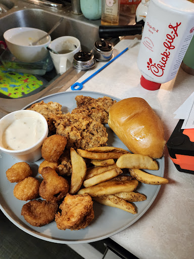 The meals arrived in a very timely manner. Everything was cooked just right and the flavor of all the dishes was excellent. My steak was cooked properly and was tender and juicy. The grilled veggies were just awesome! Fantastic flavor and grilled pretty much to perfection. The appetizers were great. The chicken fried steak dinner was not only very good it was likely large enough to feed two people. The "side" of okra was heaped into a plastic basket (like you'd get served a burger and fries in at a burger joint) and was easily enough for 3, maybe 4, people.