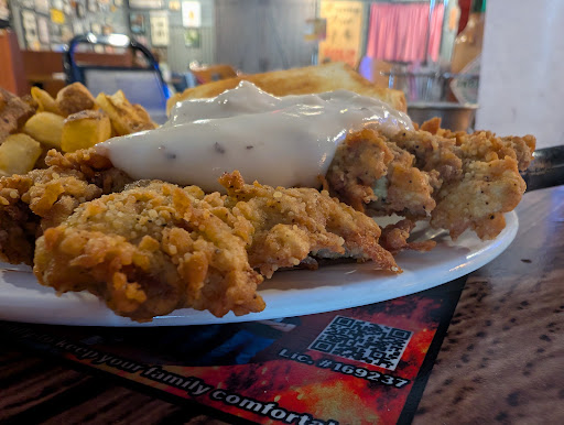 I ordered a garden salad with blue cheese dressing (excellent blue cheese and a good side salad), chicken fried steak that was as long as my forearm (and absolutely excellent), and the fries were the best sort of crispy but and tasty.