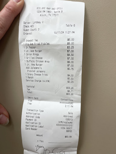 Read moreAs a local resident and a former Axe regular, I don't like leaving this rating. Alvin has limited choices for bars and restaurants, outside of fast food. Why Corey refuses to put more effort into capitalizing off that opportunity, I have no idea. The bartenders and servers have been and continue to be amazing! That might be the only thing keeping the regulars coming back and attracting others to give it a try. The food used to be good. It was consistent and fresh. There also used to be a daily special. When they expanded the space some months back, they refreshed their menu and added some items. We were optimistic, however quickly disappointed in the quality of the food. My husband and I used to come at least once a week. We decided to take a break from Axe for a couple months to hopefully let all their changes settle. We tried it again last night. It was 7pm on a Saturday following Thanksgiving. There may have been 15-20 people there, total, including the staff. Beers were cold and unfortunately so was the food. I ordered the club, and my turkey chunks were still frozen in the middle. The store-bought frozen fries were the only thing we ate because they were hot. My husband’s wrap was soggy. The bartender was great as always, apologetic and offered to remove our food from the bill. We told her it was not her fault, and we will pay for it; we were just disappointed that things were...