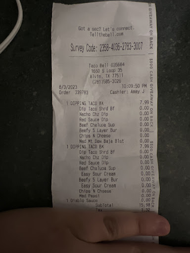 I will start by saying that the general manager there needs to manage her staff with her bossy attitude and not bring her bossy attitude towards the customers . If I could give zero stars, I would. They have the general manager working the drive-through. She obviously thought it was way beyond her means, and she should not be working the drive-through. Somebody must’ve called in sick or something. Most the time when I go there and somebody’s in the drive-through, they listen to you and take your order. I went there tonight and was specifying my order with extra onions and extra cheese on my burritos. Now keep in mind I’ve gone there a number of times and when I’ve ordered it just off the cuff with extra onions and extra cheese, Then I never get extra onions or extra cheese. Last night I went to Taco Bell and the regular person working in the drive-through listen to me and she actually made sure they added extra onions and extra cheese. So I was, Excited and like I really thought I could get that same order again done right. But when I got to the drive-through was the general manager on the speaker, and when I started to explain to her that I’ve had problems in the past with the orders, but I wanted to make sure I had extra onions and extra Cheese She kept interrupting me. I asked her I said please take my order and just stop interrupting me. The general manager was so cocky that she said look I’m not even gonna take your order you can just drive through. I’m like WTH. I’ve made a complaint with Taco Bell corporate but we’ll see how far that goes. But those of you that know me in the city asked me about this because there’s some other stuff that the general manager did that even escalated things further after I left. This is not the Taco Bell manager for Alvin or we need to revamp the...