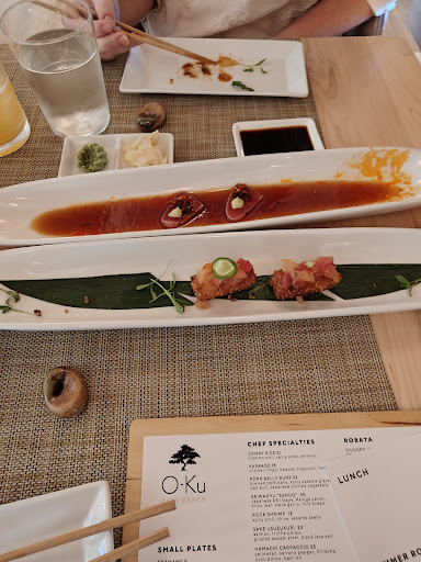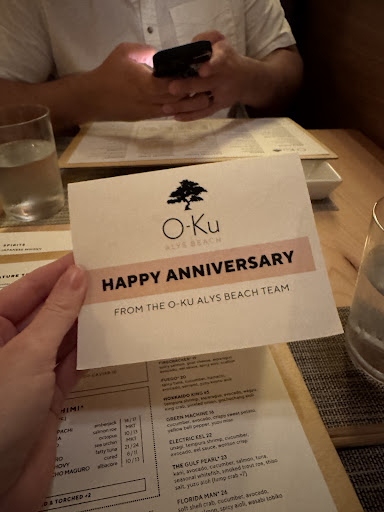 Read moreWhere do I even start. This was my first time at an O-Ku and I went with family for my birthday. I was expecting about as much as you would at any other restaurant for this occasion, but boy did they go above and beyond. I was initially greated with a framed 'happy birthday' card themed to some of my hobbies (they called ahead to one of my family members to find out) and then went even further above and beyond with a brand new Wilson outdoor volleyball sitting there as a gift. I haven't even begun on the food. Every bite was delicious, not a single complaint on the food. The roasted Corn and the Fuego were a favorite of mine. But seriously it was all so good. Extremely accommodating to my shrimp allergy and the gluten allergy of another member. Everything is brought out as it's ready so you're always getting the food fresh. No sitting under heat lamps. I personally got a little bit of everything from different sections cause you know, when in Rome. Service was top teir, every worker was busy, seemed genuinely concerned with your experience and very knowledgeable of their menu. Our server, Lee, was a master of his craft and potentially one of the most generous servers I've ever had at a restaurant. When I say the whole team went above and beyond I mean it without any BS. This particular O-ku has now become a family favorite and will likely see many birthdays from my family. I sincerely look forward to eating here again. Thank you O-Ku team for a great birthday experience. A well...