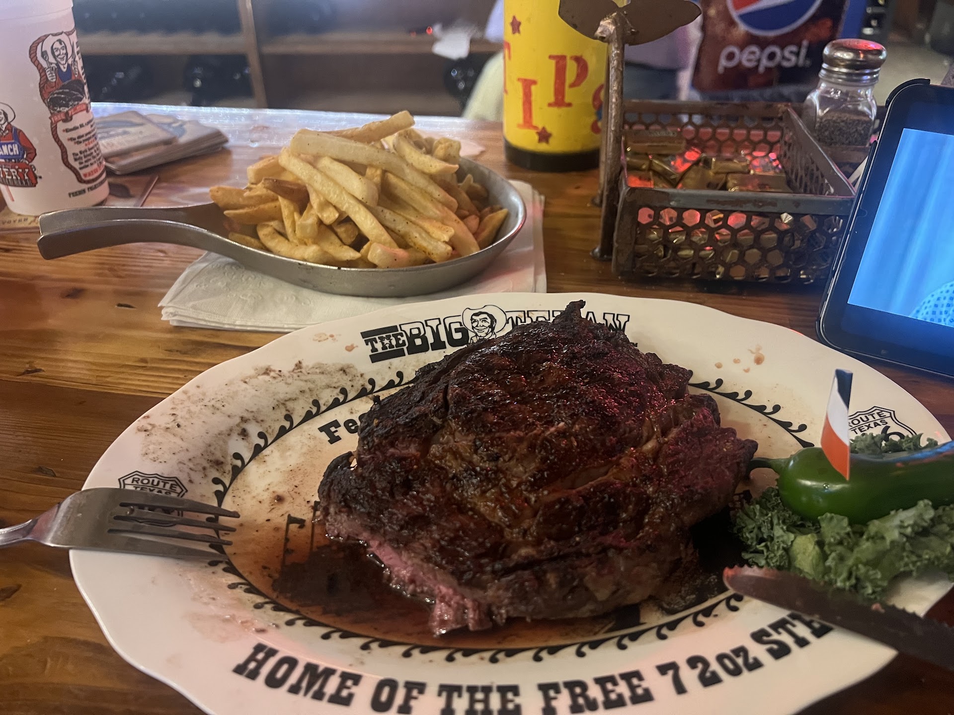 Read moreCame here as a kid during a family trip to Colorado. Decided pecan while I was working in the area. It wasn't real busy and I sat in the open bar area. My waitress was quick, cute fastest friendly and efficient. Got my 16 oz steak in less than 10 minutes from order. I got the mashed potatoes and some kind of creamed corn side that was good. Of course my steak was as expected cooked medium perfectly, juicy and tender. Topped it off with a Lonestar and a giant piece of lemon cake... That I could only eat 1 bite of.. full. Thankfully it comes in a clam shell... It's huge. Snack for the hotel. Of course this is a tourist destination so be ready for people walking around with their cameras and phones invading privacy... Just roll with the flow and enjoy the full experience. I highly recommend this. Oh yeah I did not see anyone trying the 72 oz...