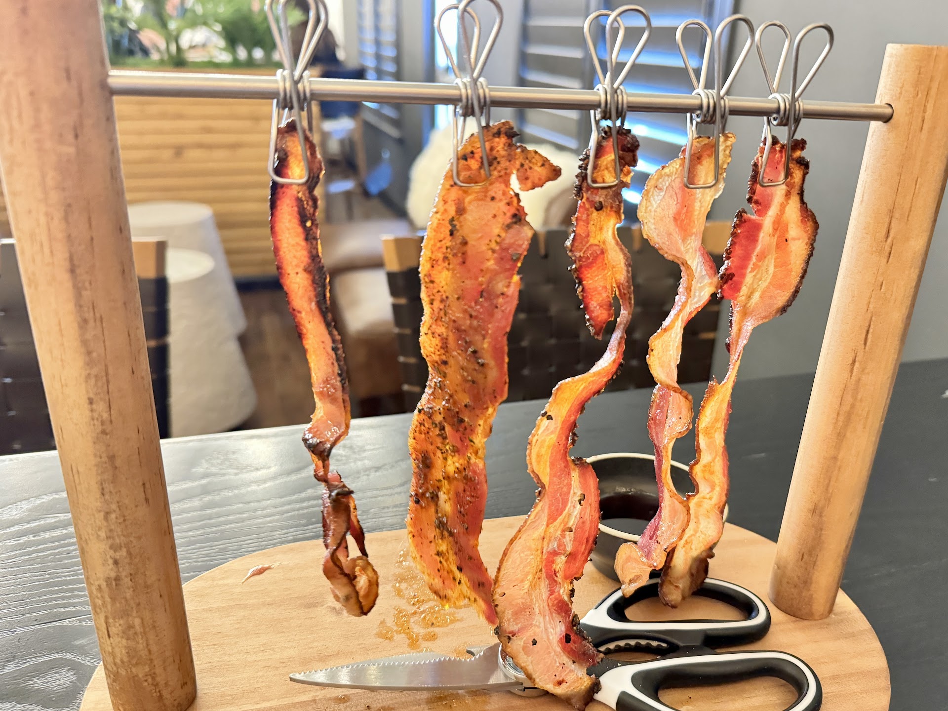 We started off with a glass of Merlot and the bacon sampler which was phenomenal. Itās a Very clever app with five different pieces of bacon ranging from maple to sriracha each hanging from a wooden dowel. They provide scissors to cut pieces off as you eat. The bacon melts in your mouth and the flavors were nicely balanced. The bacon came with a port wine reduction sauce that was out of this world.