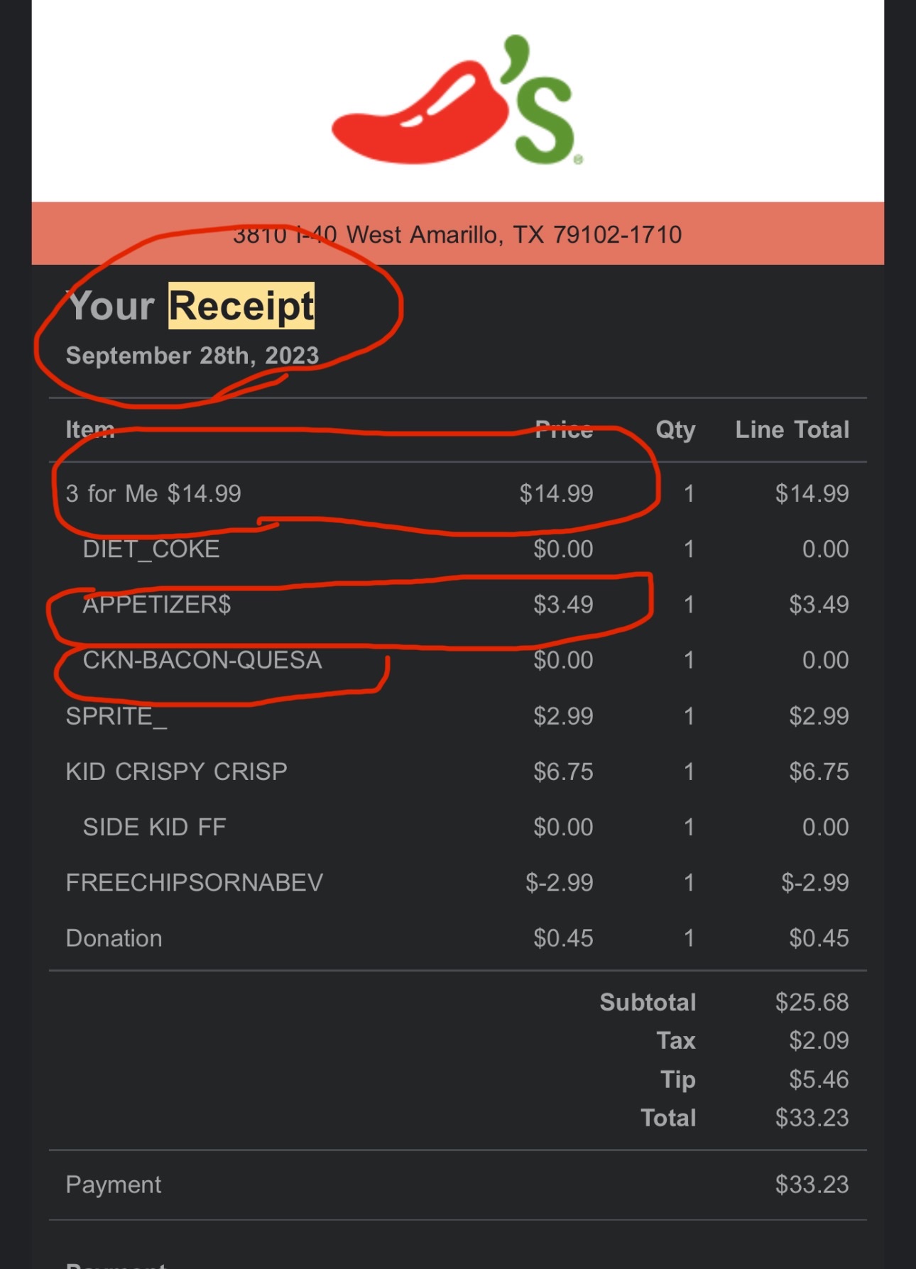 Chiliās Math Aināt Mathing. So I ordered a 3 for me for $14.99. Supposedly for $14.99 you get a drink, an appetizer and an entire. So I ordered a soft drink, then according to the menu for $3.99 you can upgrade the appetizer to a triple dipper. So everyone agrees so far that $14.99 plus $3.99 equals $18.98 and there is no $5.60 anywhere in that sentence. So my receipt comes out and I have a $14.99 charge for 3 for me a $5.60 appetizer charge and a $3.99 Dip Trio charge. The waitress couldnāt explain the $5.60 appetizer so she brought the manager over. The manager said thatās just the way it rings up. I said Iāve never seen $5.60 on any receipt before as I order this all the time. I asked her if she could bring a menu so she could explain what Iām missing. She actually rolled her eyes at me and went and got a menu. I asked her where the $5.60 was coming from on the actual menu and she said she couldnāt explain it but to trust her the charge was correct and she could do absolutely nothing about it. I know itās just $5 but the fact she rolled her eyes at me and then couldnāt explain where on the menu $5.60 came from is what went all over me. I have included a copy of my receipt from today, my receipt from September 28th that has no $5.60 charge for the same items and a copy of the menu so that maybe someone can show me...