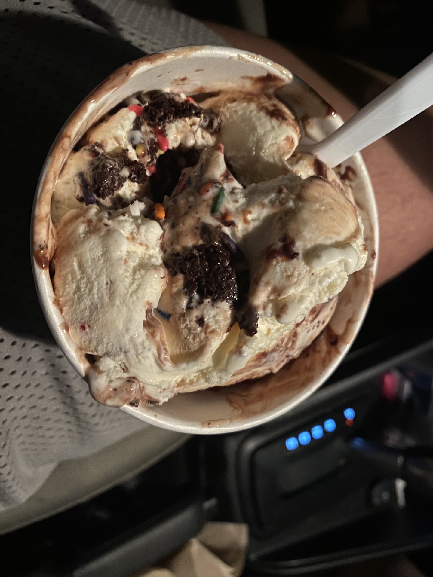 This is going to be a cheesy, or should I say creamy, review but; I just had some ice-cream door dashed to my hotel I’m staying at and let me just say, you guys brightened the end of my very dark day. I’ve been traveling cross country for the last two days with my cat & dog and I am EXHAUSTED. Today was full of rude customer service at food places, rude gas station employees and rude drivers. When I saw that Cold Stone was available on Door Dash, I jumped on it; because who doesn’t get cheered up by ice cream. Now here’s where the cheesy (or creamy) part comes. When I ordered it, I asked for it to be in Gotta have it containers because i knew it would melt some when the driver brought it. When I received my door dash from my lovely door dash driver, my ice creams were in the Mine size with a note that said “Sorry, we are out of Gotta-Have it lids, so I put it in a mine container. -Enjoy :)” I don’t know what it was about this little piece of paper; maybe the little smiley face did it, maybe it was the excellent grammar, or just the simple act of putting it in the container. All I know is that it made me feel happy and appreciated as a customer. It’s the little things that make a difference. I thank whoever wrote the note, made my order, is the store manager and who is hiring such bright and kind individuals. :)