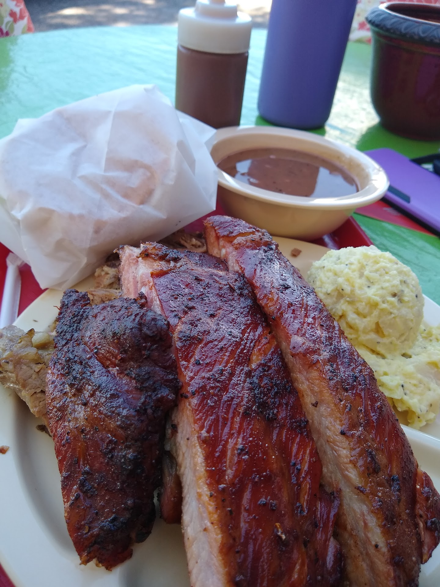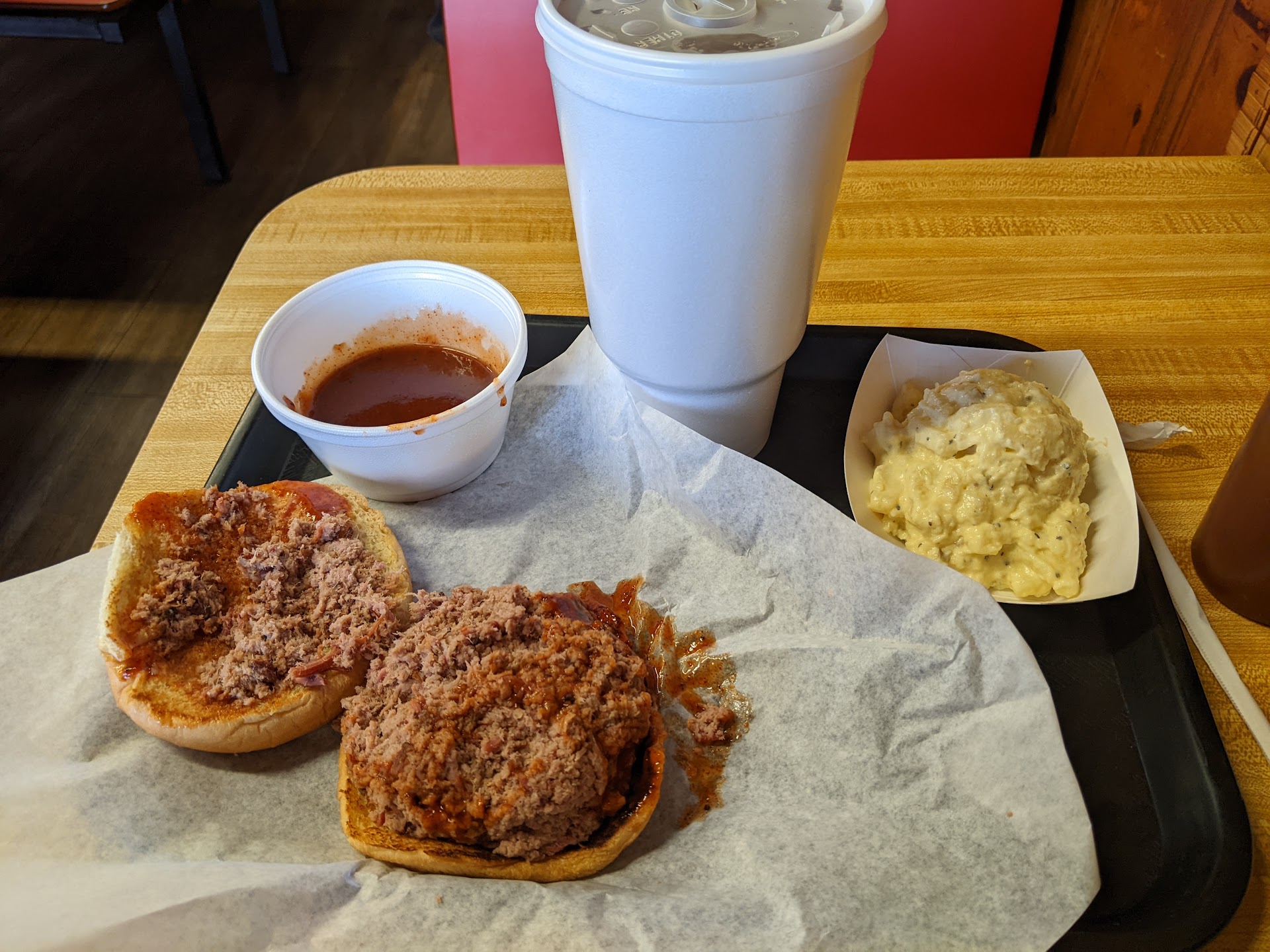 They were out of pork ribs and sliced beef.(I presume brisket.) And they don't offer pulled pork, to my dismay. So I went with the chopped beef, which was my fourth choice. It was flavorless mush and I cannot recommend it. The potato salad which served as my side was good. The chopped beef sandwich, potato salad, and sweet tea were $12.00, shown below.