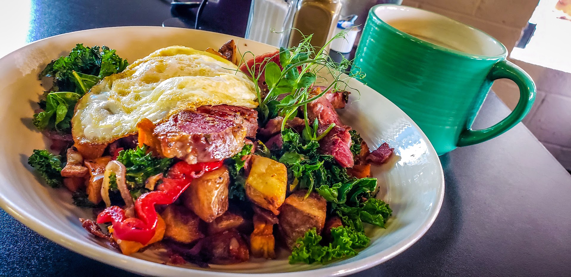 Recommend for breakfast or even just coffee and a baked good. Kind of easy to miss as it's a bit back away from the road; just turn as if you're going to the Shell station and you'll see it behind to the side. It's cafe/diner style, so you order and pay for your food at the front, then seat yourself; don't forget to grab silverware from the table in the corner too. The staff is very friendly and open to conversation - I guess you could call it southern hospitality. The food is definitely better than your standard fare, the French toast is above average and the eggs are fresh cooked. The bacon was the most surprising - I think they might use jerky seasoning, and they have specialty jalapeno bacon that was just way too spicy for me. I couldn't stomach it, but there's no denying that it was high quality. They only serve regular house coffee (nothing fancy like lattes such) but the house coffee tastes great. They provide real half & half, which is an awesome break from all the fake crap. Another nice perk here is their lemon infused water, which I was informed they use fresh lemons from Arizona to prepare. No sweetener in it so it's just a straight refreshing citrus taste. I arrived right when they opened so no telling how busy they are throughout the day, but it wouldn't surprise me if they are, especially on Saturdays. Definitely recommend, perfect for dates and...