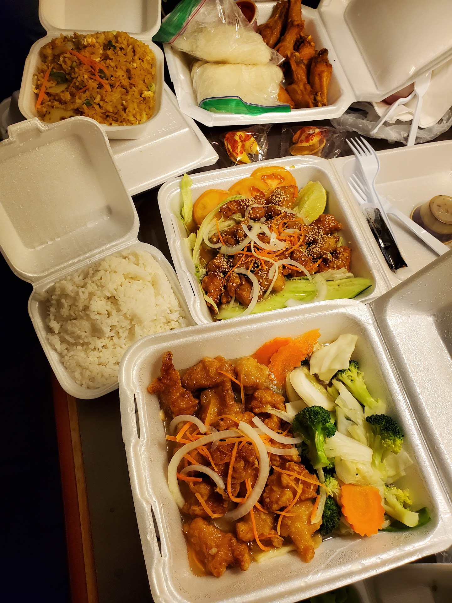 This was an unmitigated disaster. The food was way overpriced to start with. The cheese wontons were okay. Everything else was bland or simply not what we ordered. The sesame chicken and sweet and sour chicken we ordered both were just unseasoned chicken nuggets, the kind you can buy in bulk at any sam's club. We specifically asked for soy sauce but got a wad of red peppers in oil. All the other sauces were so watered down as to be flavorless. The pork fried rice I ordered was chicken instead, and was likewise bland and unseasoned. We ordered our meal to go and the staff was friendly and gave us free drinks while we waited, so they get some credit, but the whole meal, most of which went uneaten, went...
