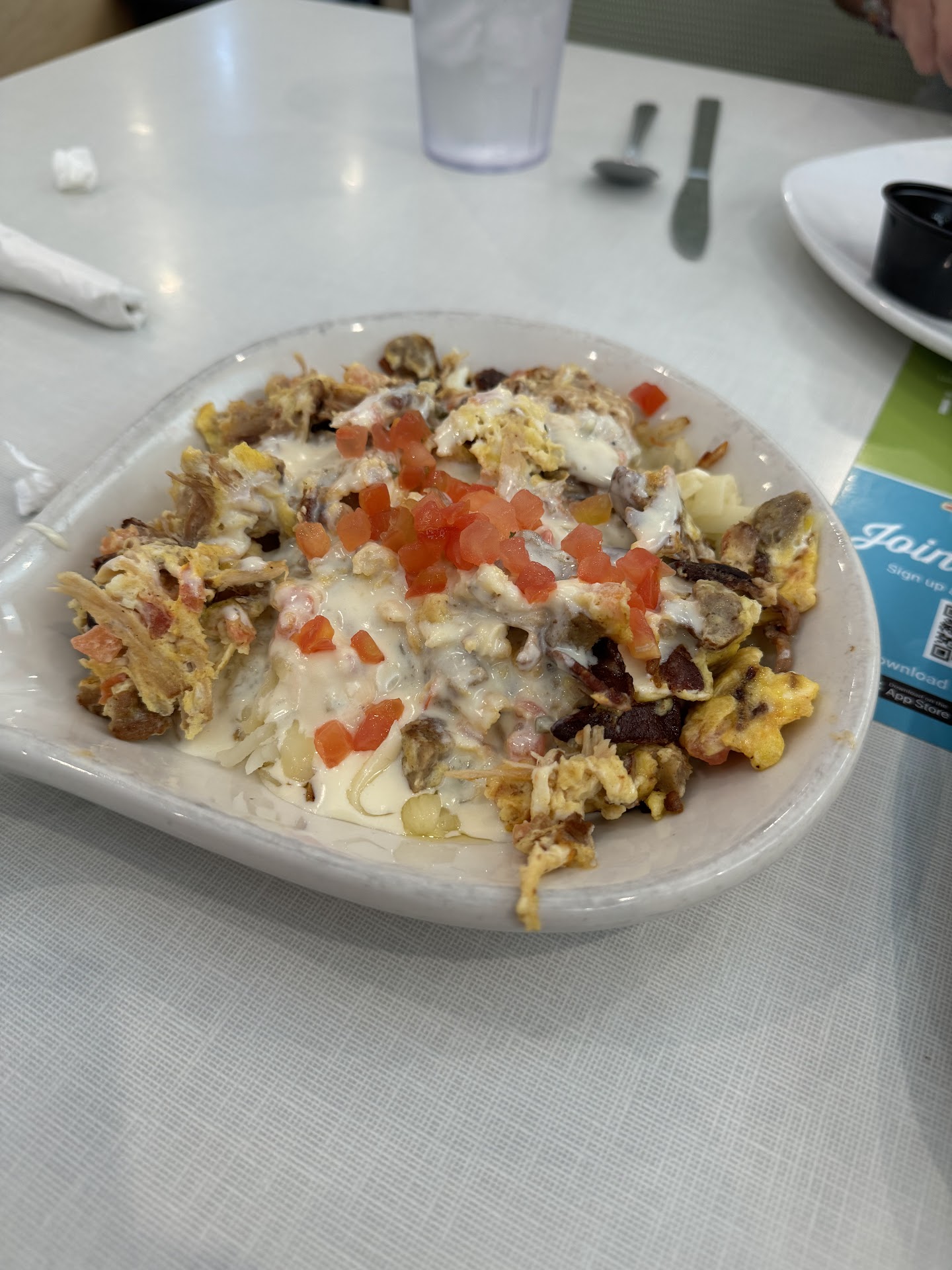 I ordered the Cowboy Skillet, and my wife got a standard breakfast plate with special chocolate pancakes. The food came out incredibly fast, even with the restaurant being so busy, and everything was fresh, hot, and delicious. The Cowboy Skillet was hearty and packed with flavor, while the chocolate pancakes were a hit for my wife—they were perfectly cooked and indulgent.