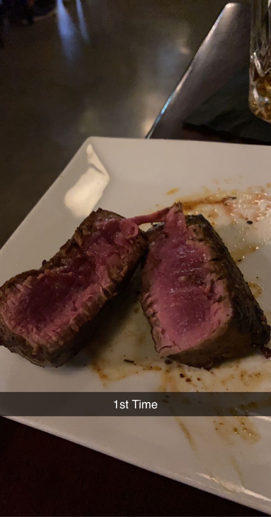 Read moreThe kitchen really let down the service. We called ahead to let the restaurant know we would be about 15 minutes late to our reservation because my flight into Amarillo was delayed. When we arrived at the restaurant, we were greeted by the Manager, where we apologized for being late. He cut us off and said "Yes, I know all about it". Okay.... weird. We were sat at the big striped chairs in the back. The ambiance is great. Looks like a great place for cocktails and horderves... however the Appetizers on the menu are glorified bar food... not many choices, and not really catered for cocktails. We ordered the cheese board with charcuterie - the plate was overwhelming, with tiny cheese cubes which look like they were purchased from Sam's Club, rotted strawberries, crackers that were store bought, and a massive amount of hot peppers, martini olives and pickles. We didn't even get an introduction as to what was on the board, and just had to figure it out. The Caesar salads were great - nice and cold, not overly dressed, and seasoned well. When it came to our meals, the duck was fantastic! Perfectly seasoned with a paired sauce. Great Stuff. When it came to my steak however, I asked for it to be prepared Medium Rare. I had to send the steak back twice - and it still wasn't cooked properly (I have included photos for each time I received it back from the kitchen) but at least it was edible. Upon each time I got the steak back - returned by the manager twice - he didn't really say much of anything and he kind of hovered which felt a little weird. I wasn't expecting any type of cut on the bill, but it would have been nice to be offered something - at least a free desert or maybe comped cocktail for the fact I couldn't even eat my steak, and by the third time - I gave up on the kitchen and just filled up on everything else to eat. Mashed potatoes were delicious though. Our waiter was great - attentive, and very nice. And again, the place is cute. I can see they are still trying to find out what they are good at... but to claim you are a fine dining restaurant - definitely needs to step up their kitchen game. The appetizer menu needs to have better options - I felt like I could get everything at TGI Fridays. To not be able to prepare a steak properly when that is the one dish you will sell more than anything on the menu - that's a problem. Overall - $200 for a meal and 4 cocktails, definitely...