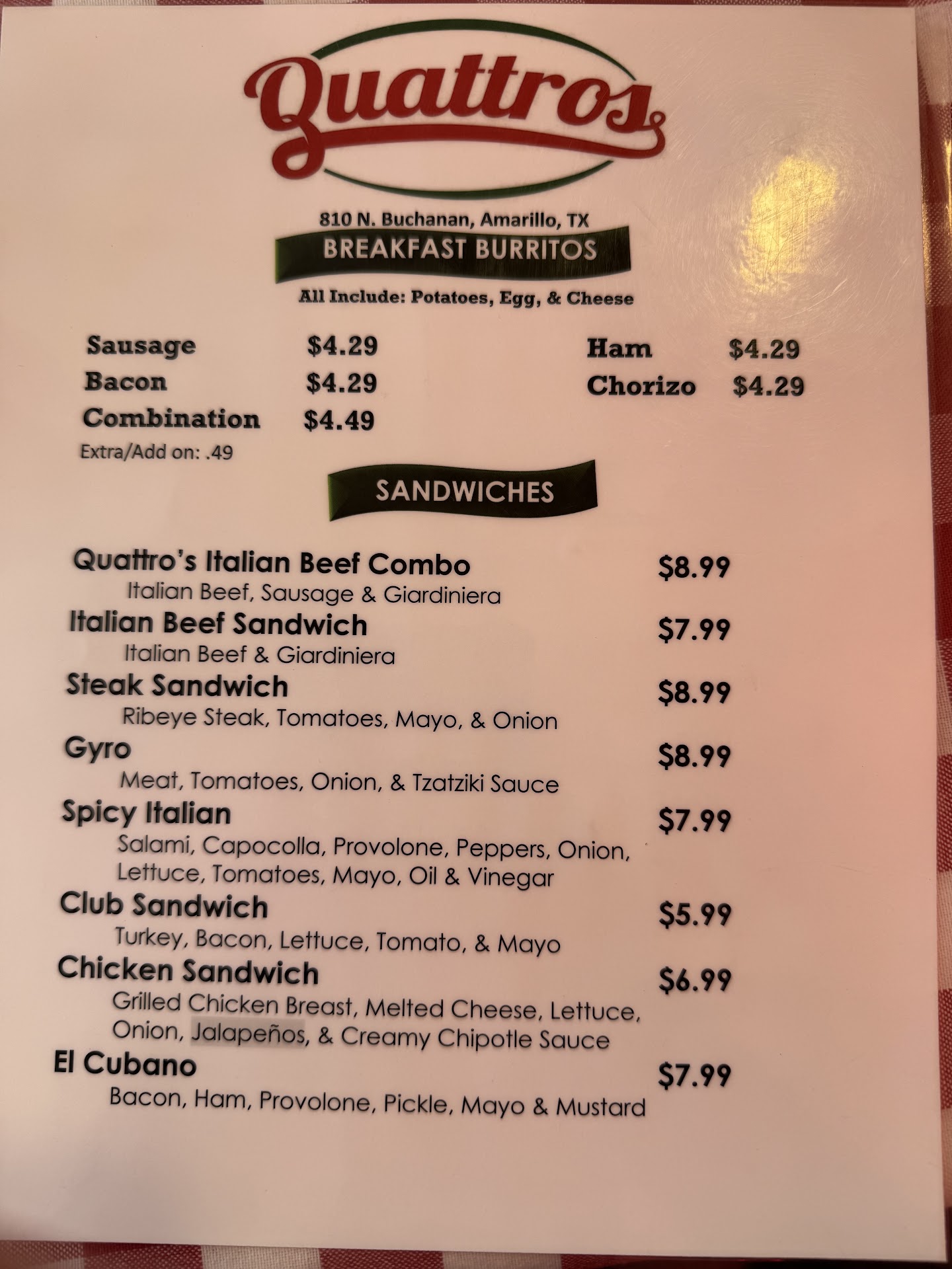 Read moreDeparted Amarillo for greener pastures months ago, but I felt the need to go back and give Fidel and his establishment credit for providing an authentic Italian Beef sandwich in the armpit of Texas. I lived in Amarillo for 3 years and the closest thing to Italian beef I found made me wake up expecting a parasite to burst forth from my gut. Quattro’s on the other hand provides authentic Chicago flavors and the decor is a warm homage to the Italian-American subculture that shaped so much of America east of the Mississippi. If I could give 6...