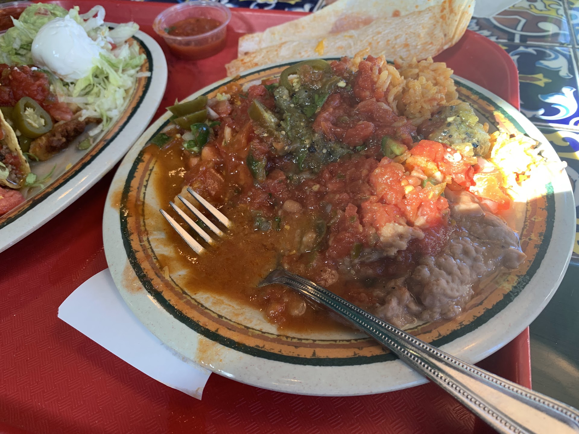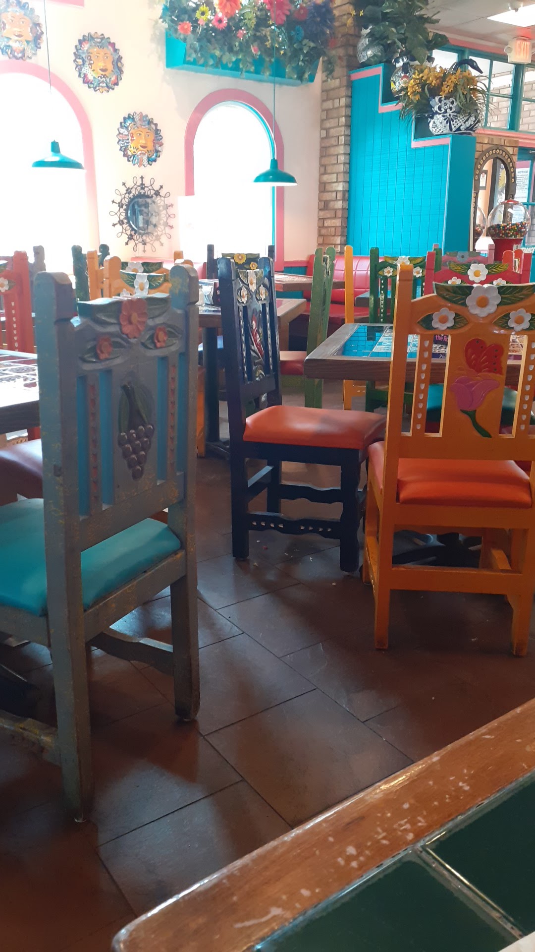 Read moreDelicious food, AMAZING Atmosphere inside. Good! selection of choices on their menu, from plates/platters with the beans and rice to a la carte items. We love so much from their menu that it's hard to choose favorites. I've always always liked their fajita taco with the guacamole in it. Their burritos are good, fresh!! hot tortillas with every plate ordered. Their chips and salsa and Wonderful chopped onion, pico de gaillo and salsas bar inside is such a NICE extra to eating inside. Plus their fresh unsweet or sweet tea at soda fountain counter is awesome. Delicious food whether you enjoy it inside their gorgeous authentic Mexican dining room, spacious btw!, or go through drive thru. They'll take care of you! Oh! I can't forget to tell you about their Awesome! Chocolate cake slices. Theyre usually cut 2"x 4 or 5" rectangle. A decent size, and OH SO GOOD. (There's pecan pieces in the frosting though, so hopefully you like a little bit of pecans in their homemade chocolate icing). Carrot cake too or sopapillas. Try them at least once! Dining inside, it's so refreshing...