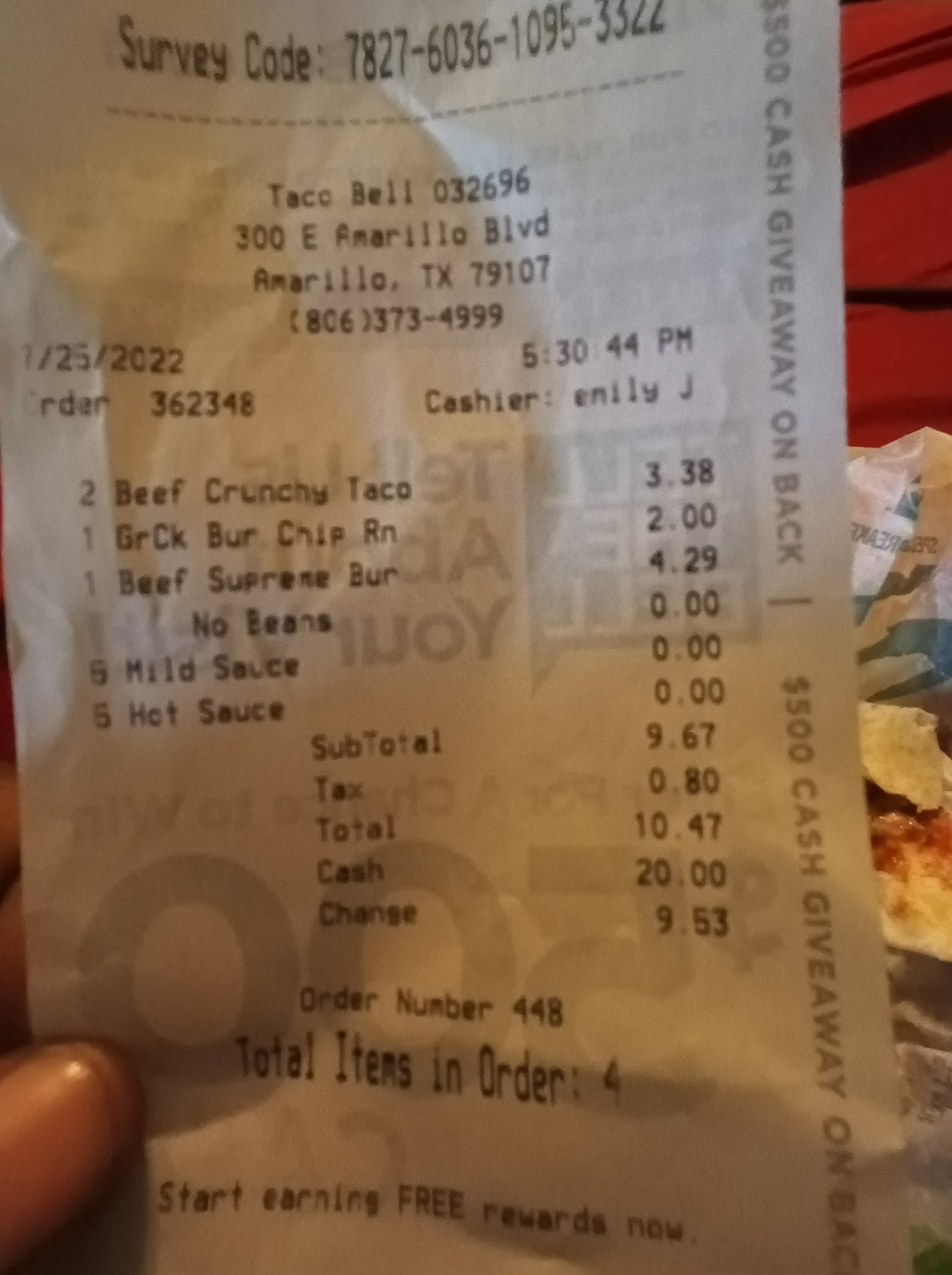 Ā Ā Ā Read moreMy goodness, folks. I am astounded. Two visits to this Taco Bellās drive-through now, and each time the person working the window and taking the orders didnāt sound like serving a customer was the greatest inconvenience that could possibly occur in their entire existence, every menu item was still available because they hadnāt run out of ingredients (even Mexican Pizza wasnāt an exception), and we ended up with truly every item we actually ordered. Do I feel strange about awarding a perfect 5 star rating to a Taco Bell due to them meeting the bare minimum requirements for good service based off of two visits? Not at all! I may be premature in crowning this Taco Bell as the best in Amarillo, and itās honestly genuinely decent even if the bar werenāt miserably low here, but I doubt the few Taco Bells in town that Iāve so far had the good fortune of having not yet eaten at could manage to consistently refrain from being disappointing on multiple levels two...