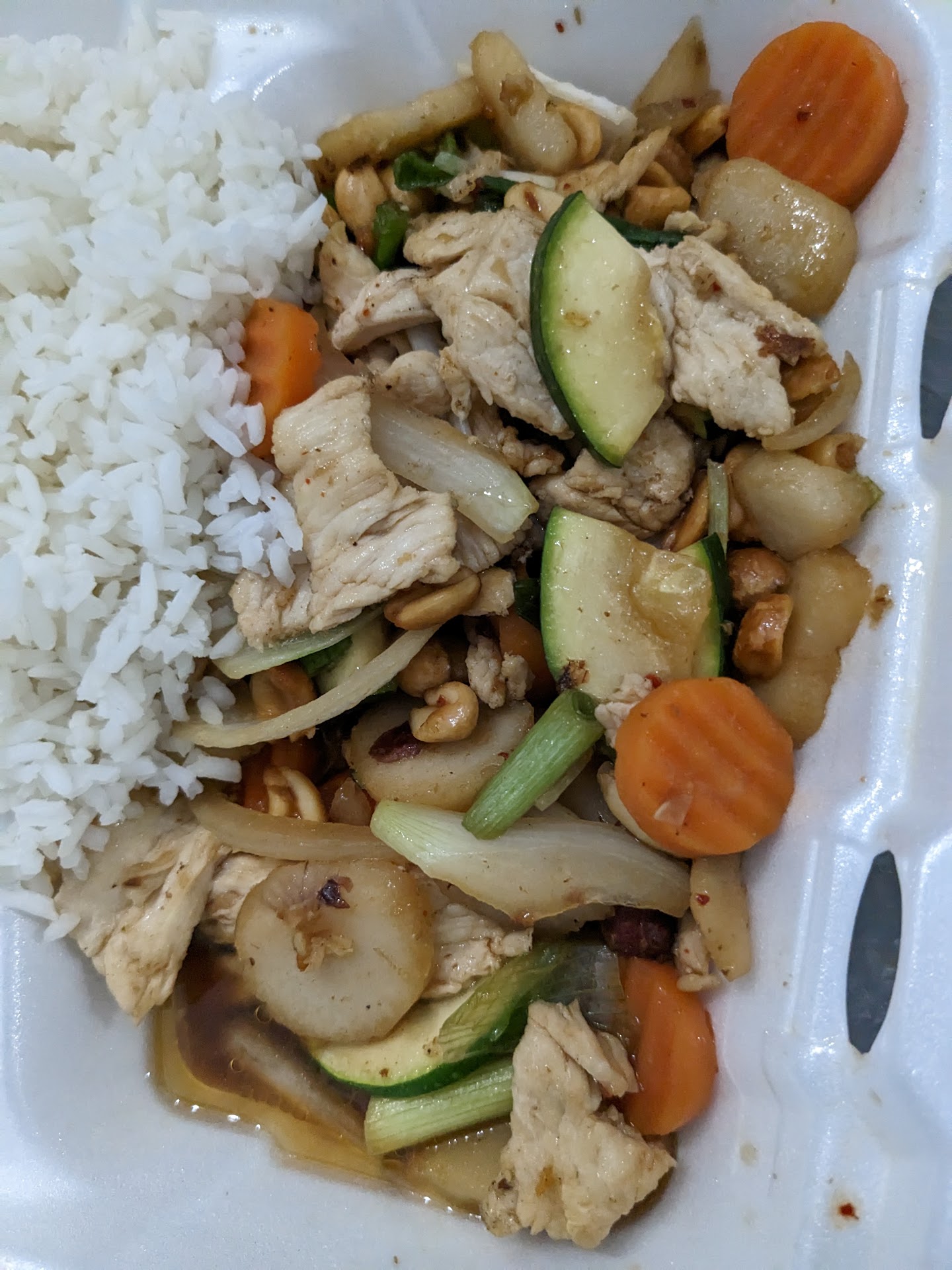 I ordered the Yellow Curry. I had noticed that the list of proteins did not contain tofu, yet there was a tofu dish elsewhere on the menu. So I asked if they would be so kind as to sub tofu for meat, which they gladly did. My order came with a huge serving of steamed rice as well.
