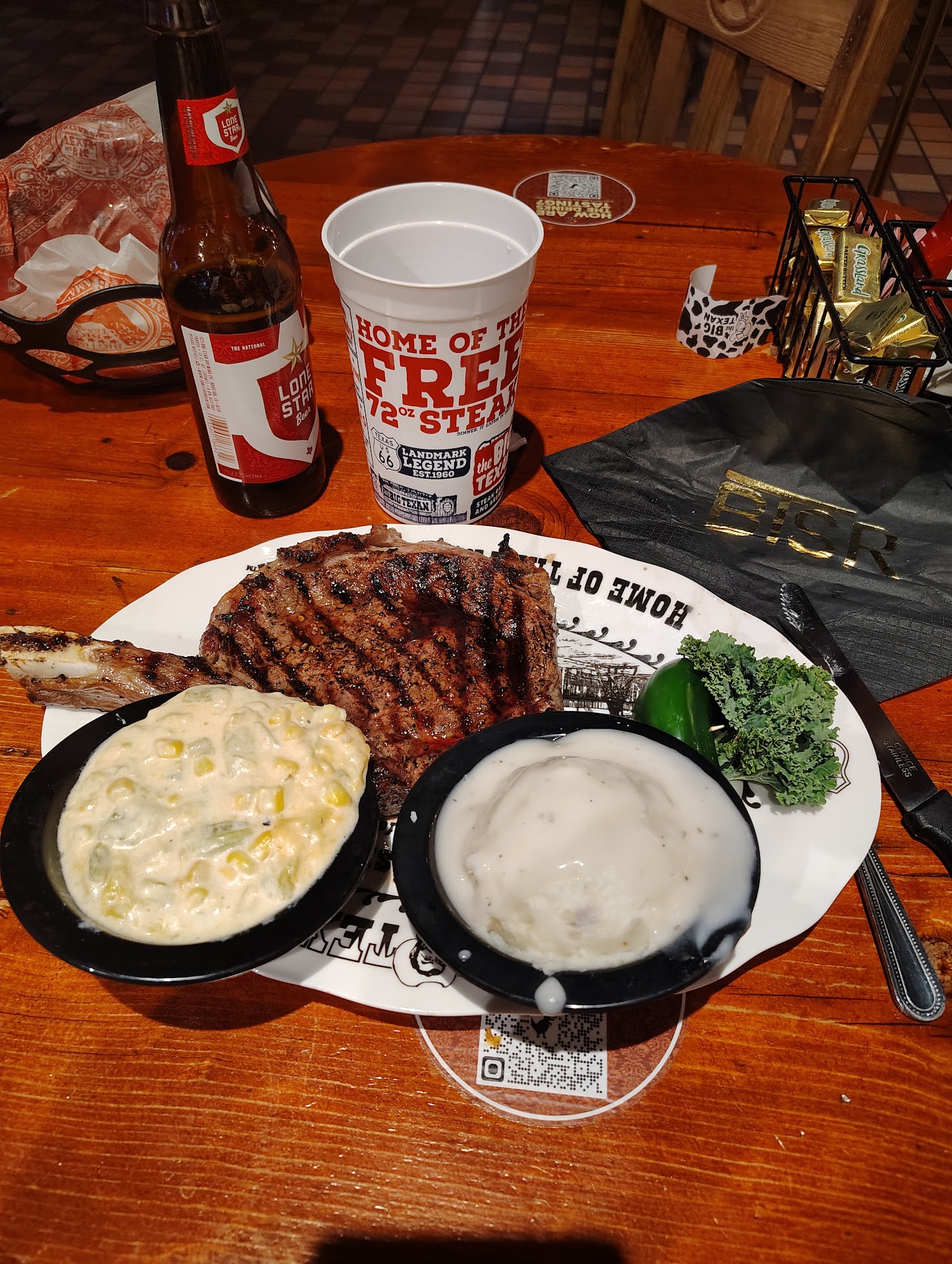Read moreCame here as a kid during a family trip to Colorado. Decided pecan while I was working in the area. It wasn't real busy and I sat in the open bar area. My waitress was quick, cute fastest friendly and efficient. Got my 16 oz steak in less than 10 minutes from order. I got the mashed potatoes and some kind of creamed corn side that was good. Of course my steak was as expected cooked medium perfectly, juicy and tender. Topped it off with a Lonestar and a giant piece of lemon cake... That I could only eat 1 bite of.. full. Thankfully it comes in a clam shell... It's huge. Snack for the hotel. Of course this is a tourist destination so be ready for people walking around with their cameras and phones invading privacy... Just roll with the flow and enjoy the full experience. I highly recommend this. Oh yeah I did not see anyone trying the 72 oz...