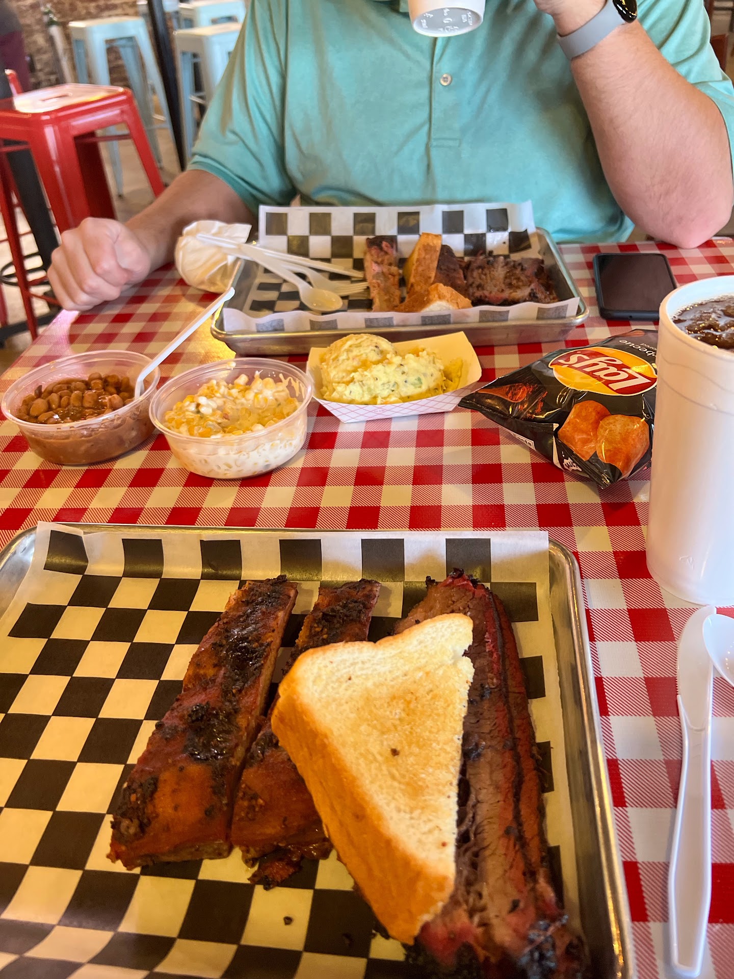 I judge a barbecue place by their brisket, ribs, and pork. The drive thru menu is easy to read, so quickly I saw a combination plate that had two of the three meats I wanted to try. I hoped to have fries as a side, but that was not an option. The guy taking my order sped through the side options so fast and understandable I had to ask three times what my options were. He sighed and dramatically rolled his eyes. The only thing I heard was chips. I apologized for not being able to understand him and told him that this was my first time trying Tyler's. He apologized for saying the options so fast, threw in some extra ribs, and continued to apologize several times. I was not upset that I could not understand him, but by the way we treated me and spoke to me. Also, him rolling his eyes, shaking his head, and frustration told me this question is probably asked often, and he's annoyed with having to repeat the sides.
