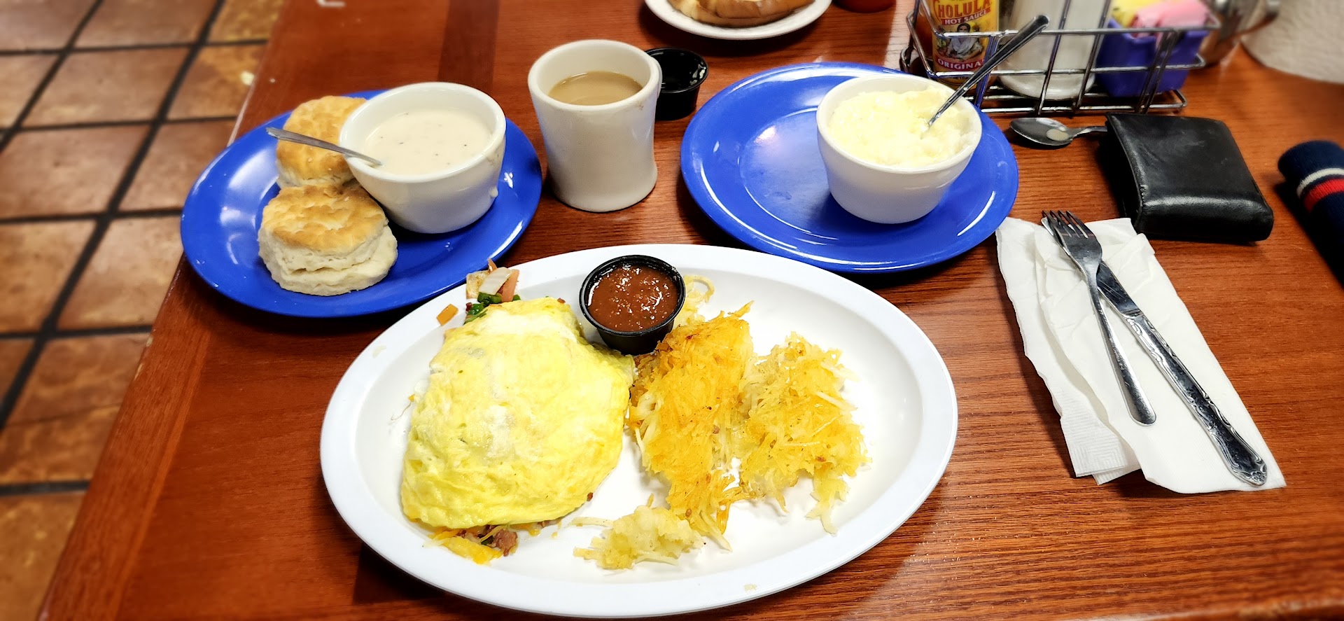 The food was pretty good. I had planned on trying the chicken-fried steak and eggs that got such great reviews, but ordered an omelet meal instead. The meal size was hearty, and the omelet was very good, with a large helping of filling. The hashbrowns were -- well, just normal, everyday diner hashbrowns. The disappointment was the two biscuits and cup of gravy that were part of the meal.